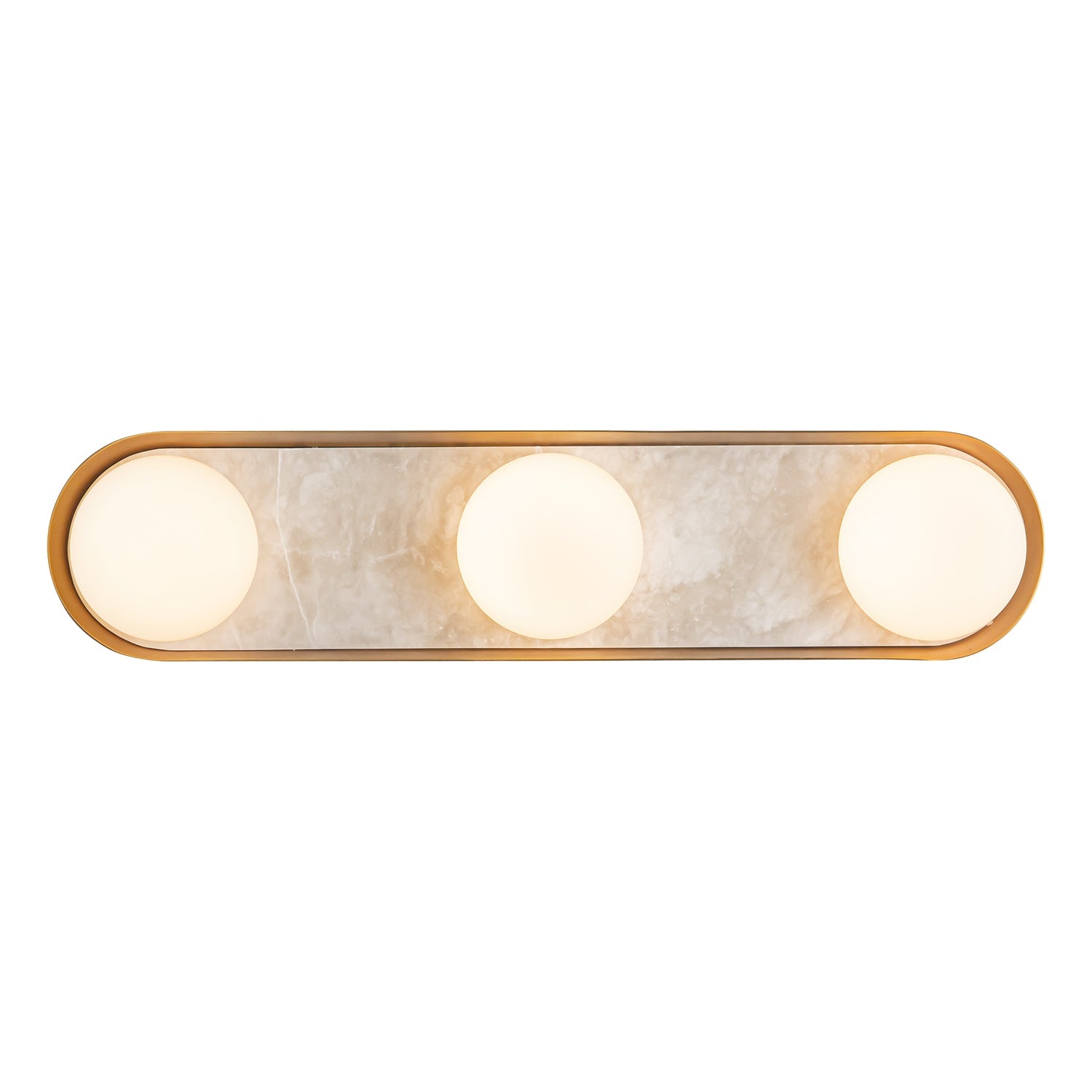 - An elongated alabaster vanity wall light casts a spa-like glow and elevates wide mirrors