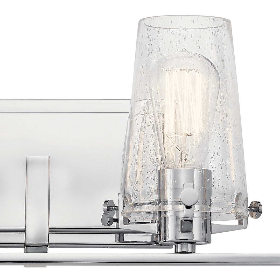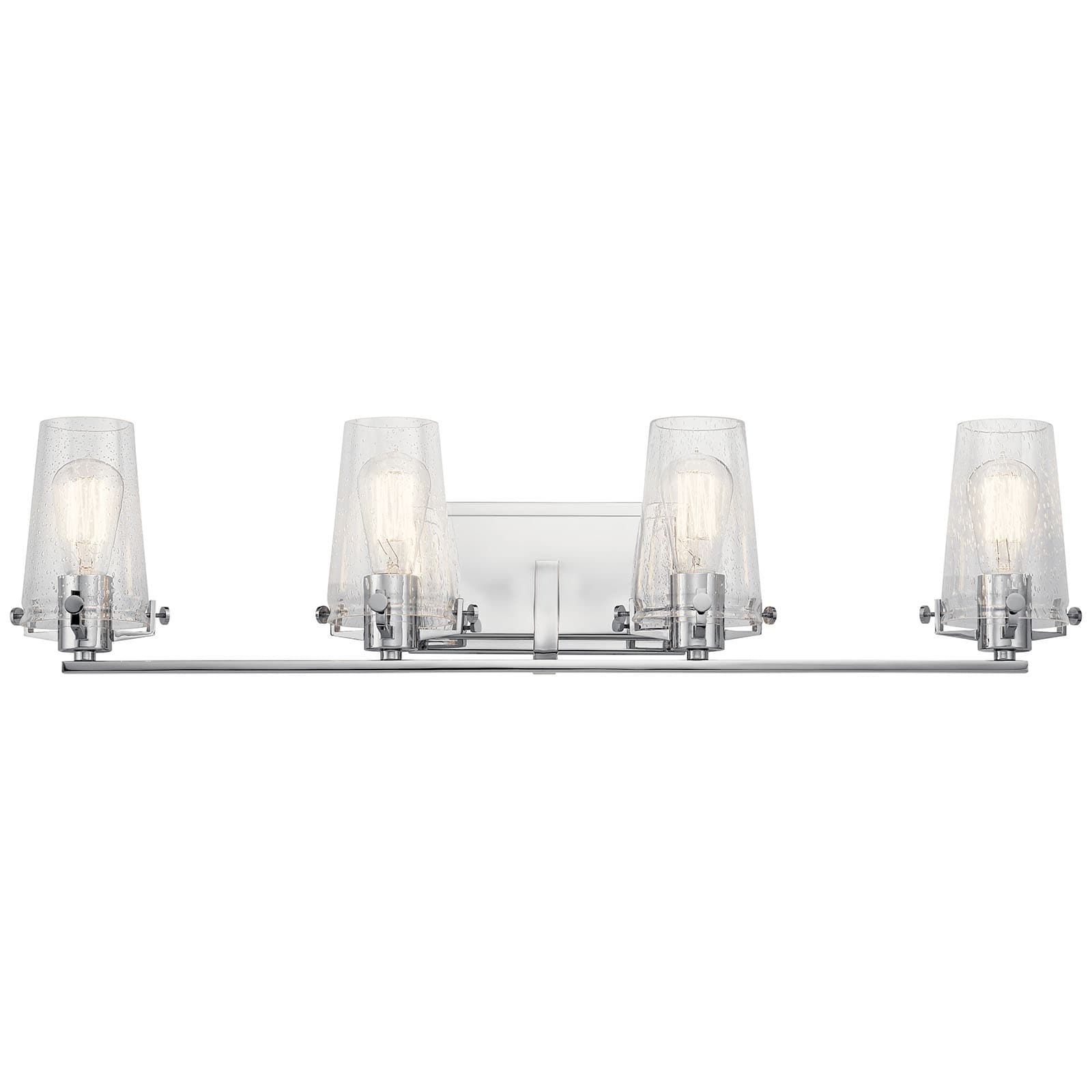 Bathed in a soft glow, this 4-light vanity fixture turns everyday routines into moments of quiet elegance. The artisanal glass shades, delicately speckled with subtle texture, sparkle as they diffuse the light across your space. Designed for both beauty and function, it offers the flexibility to shine upward in graceful arcs or downward in a warm cascade, making it a statement piece for larger vanities and bathrooms alike.