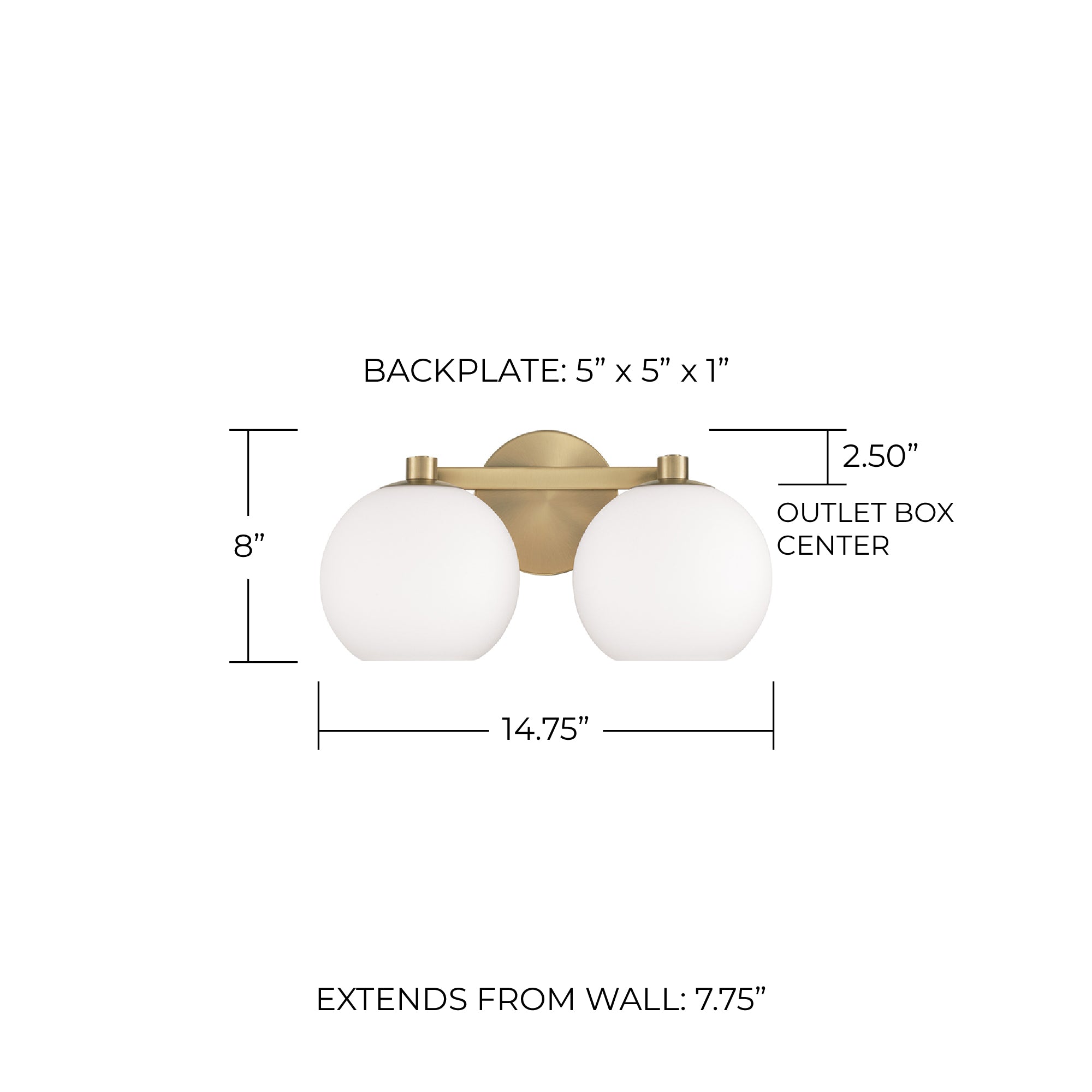Circular forms meet all-around versatility in the Cahya 2-Light Vanity for Francis Millar. The Soft White glass globe shades illuminate sophisticated style, while the Aged Brass finish creates a mid-century aesthetic.