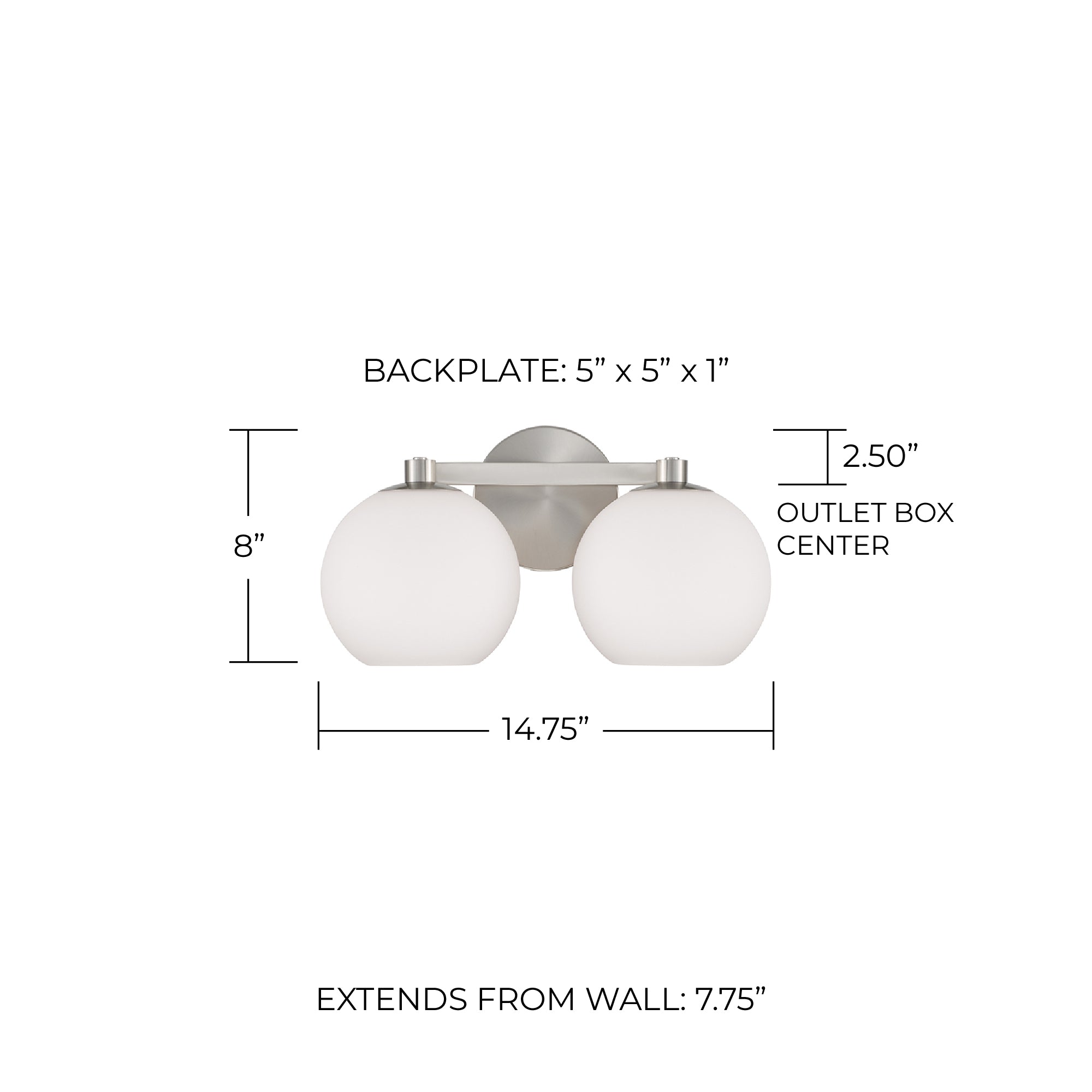 Circular forms meet all-around versatility in the Cahya 2-Light Vanity for Francis Millar. The Soft White glass globe shades illuminate sophisticated style, while the Brushed Nickel finish creates a classic aesthetic.