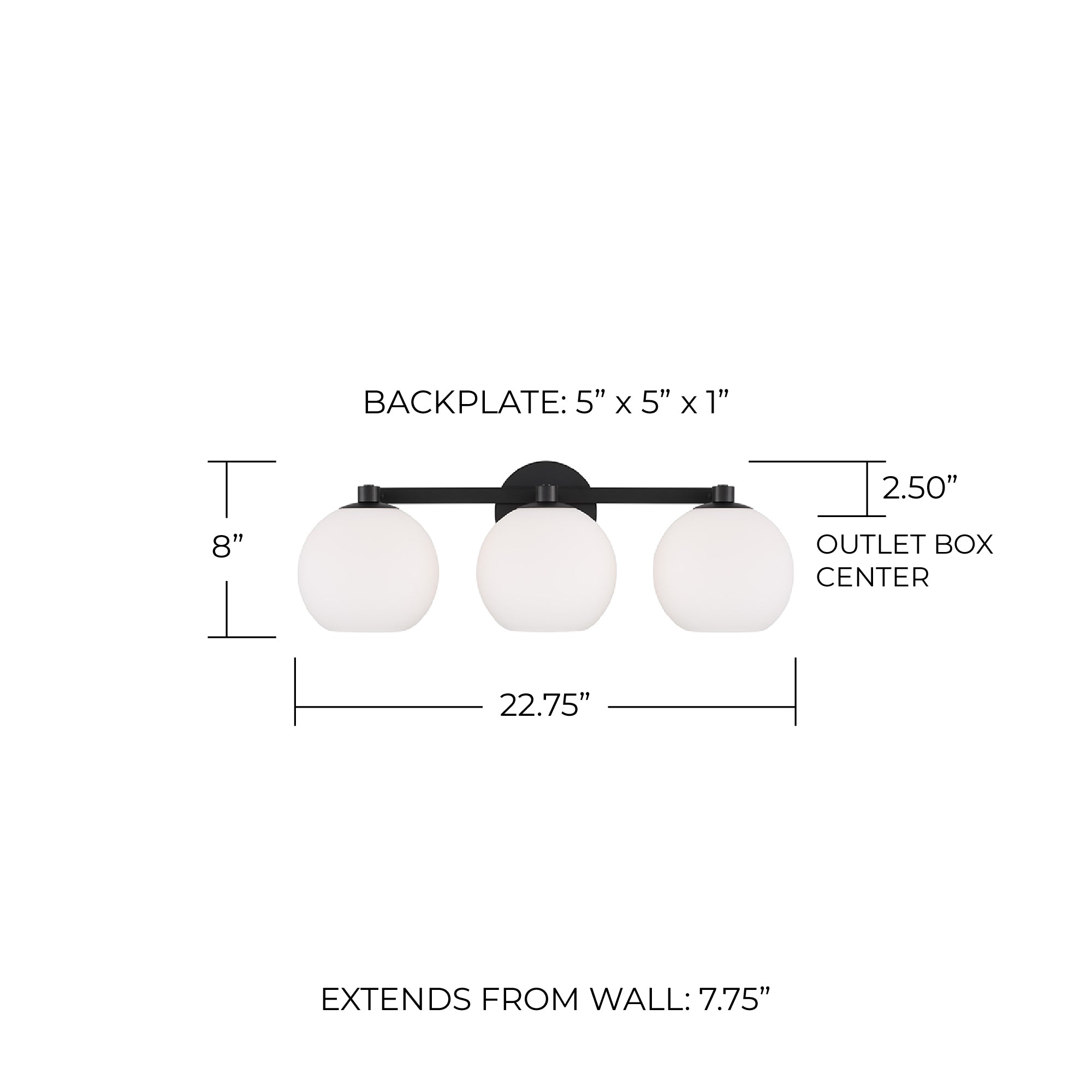 Circular forms meet all-around versatility in the Cahya 3-Light Vanity for Francis Millar. The Soft White glass globe shades illuminate sophisticated style, while the Matte Black finish creates a sleek contrast.