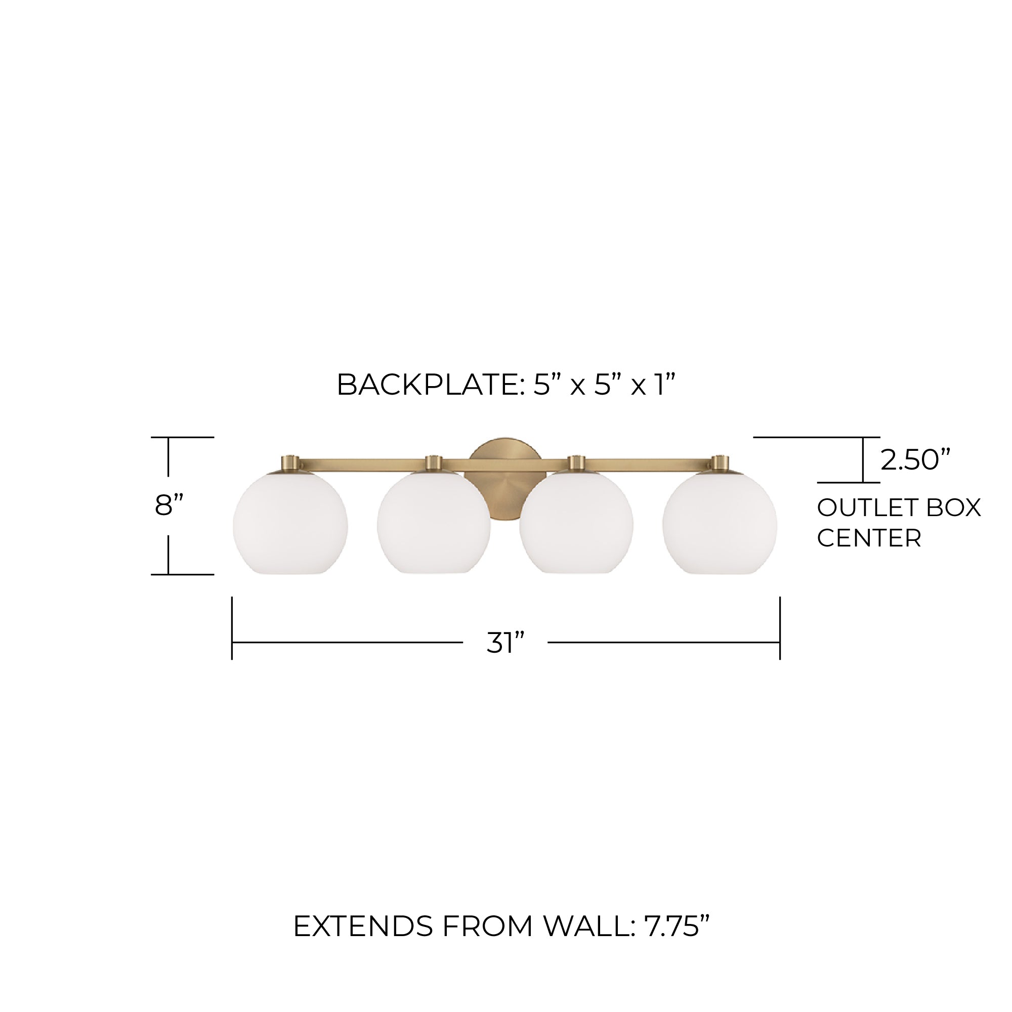 Circular forms meet all-around versatility in the Cahya 4-Light Vanity for Francis Millar. The Soft White glass globe shades illuminate sophisticated style, while the Aged Brass finish creates a mid-century aesthetic.