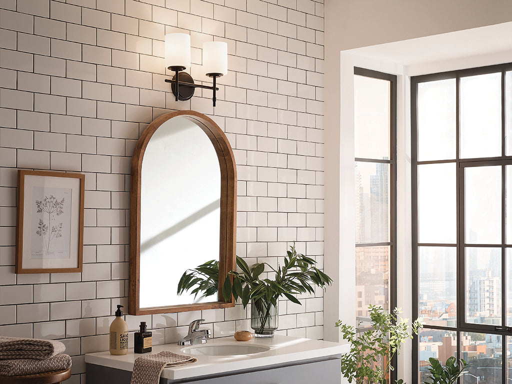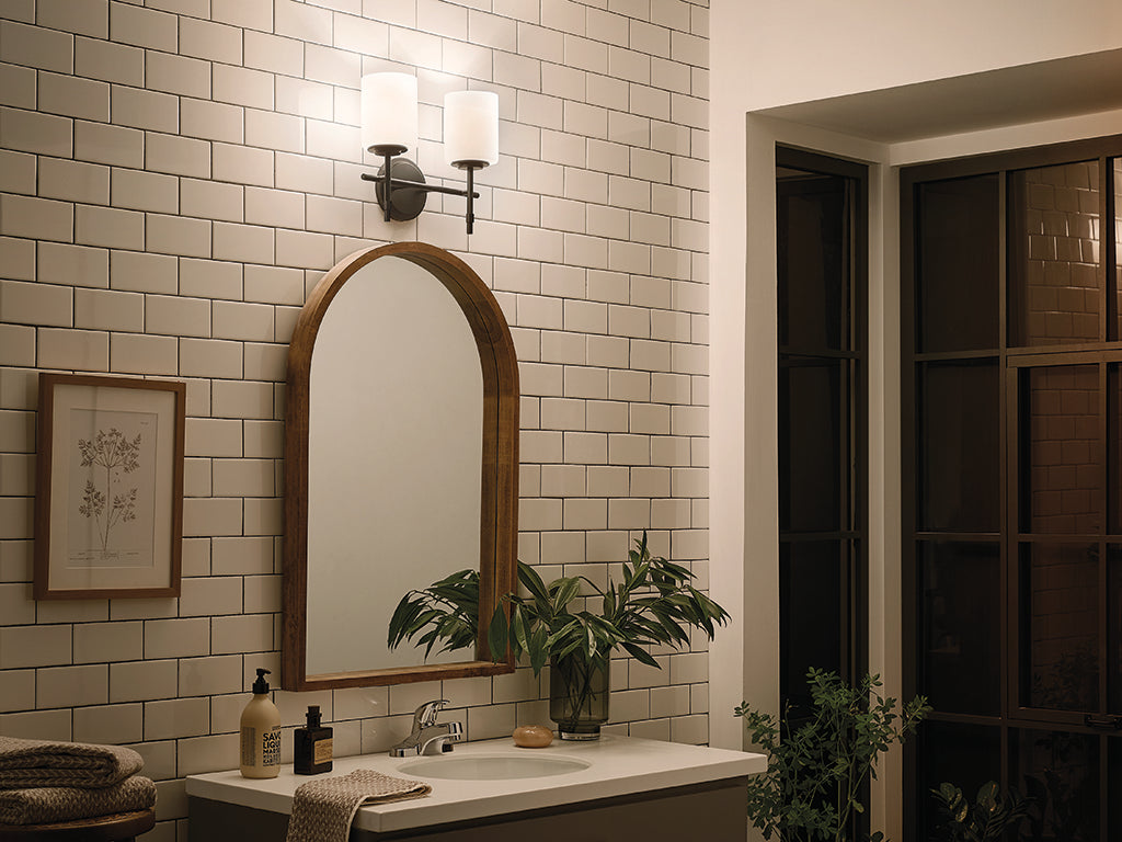 - A modern classic two-light vanity light envelopes spaces in soft, inviting light