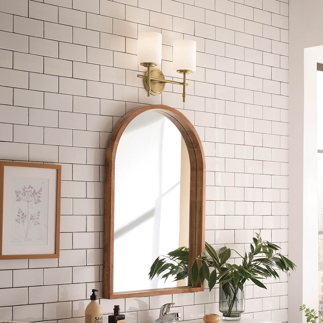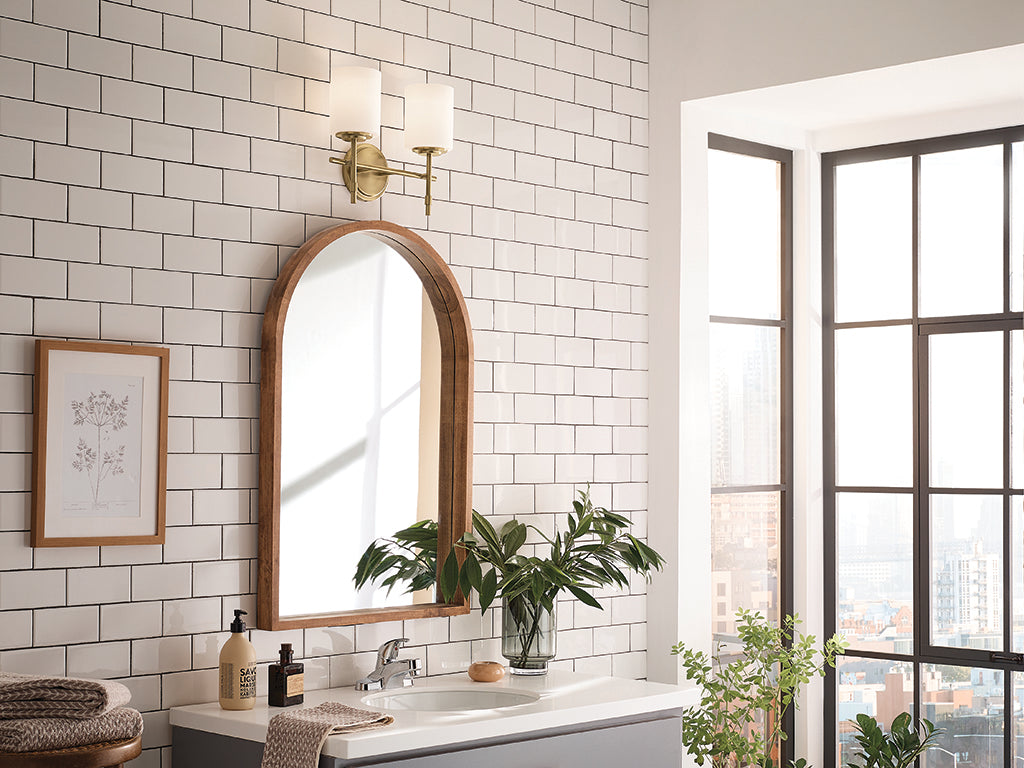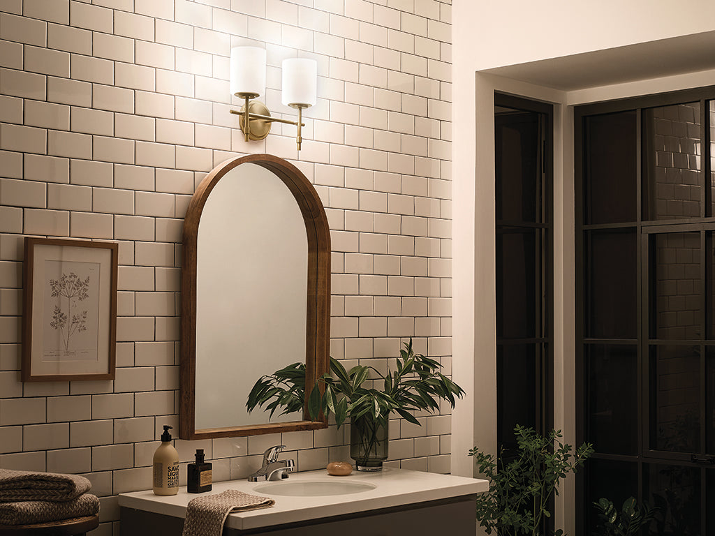 • A modern classic two-light vanity light envelopes spaces in soft, inviting light