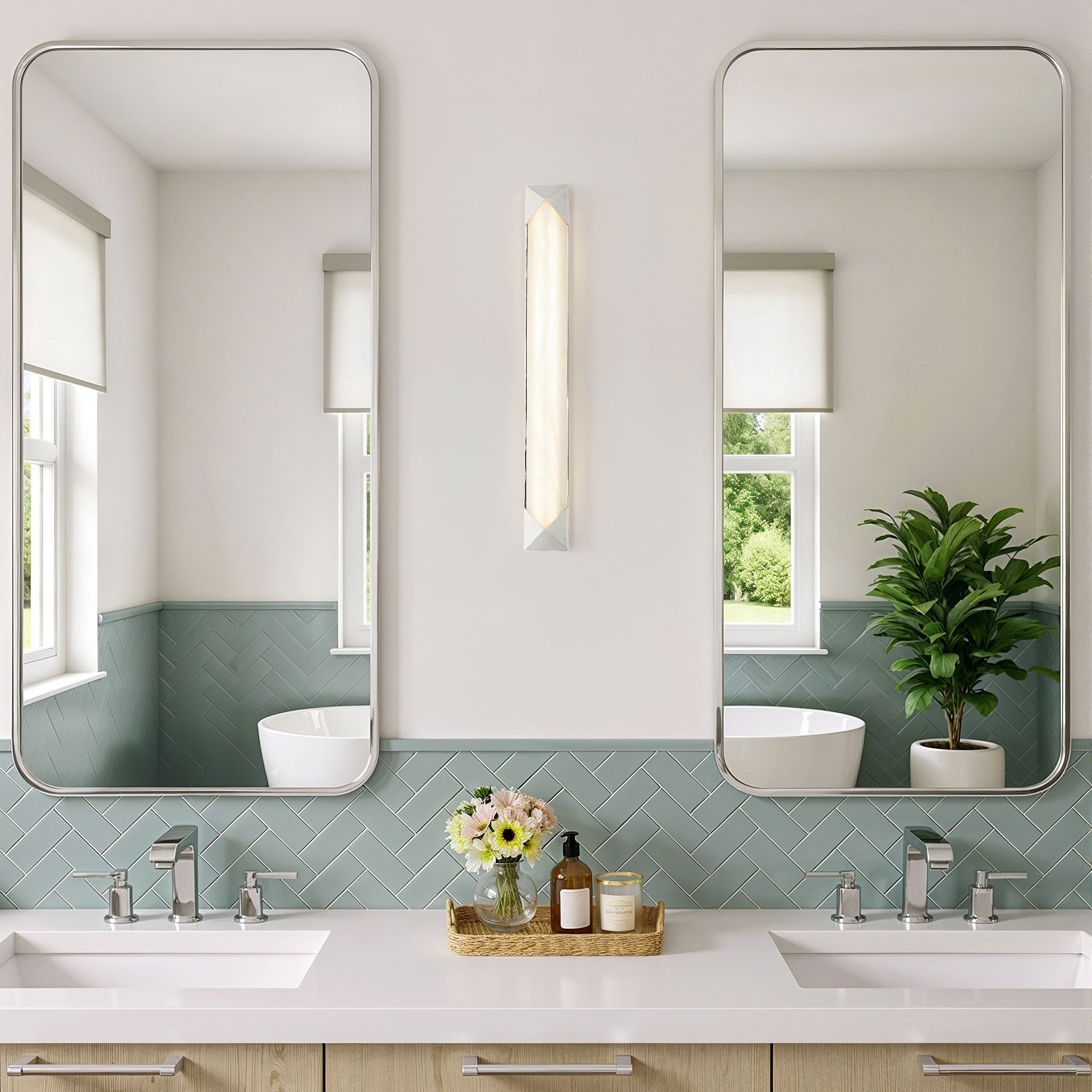 - An elongated alabaster vanity wall light brightens wide mirrors with a refined, gallery-like glow