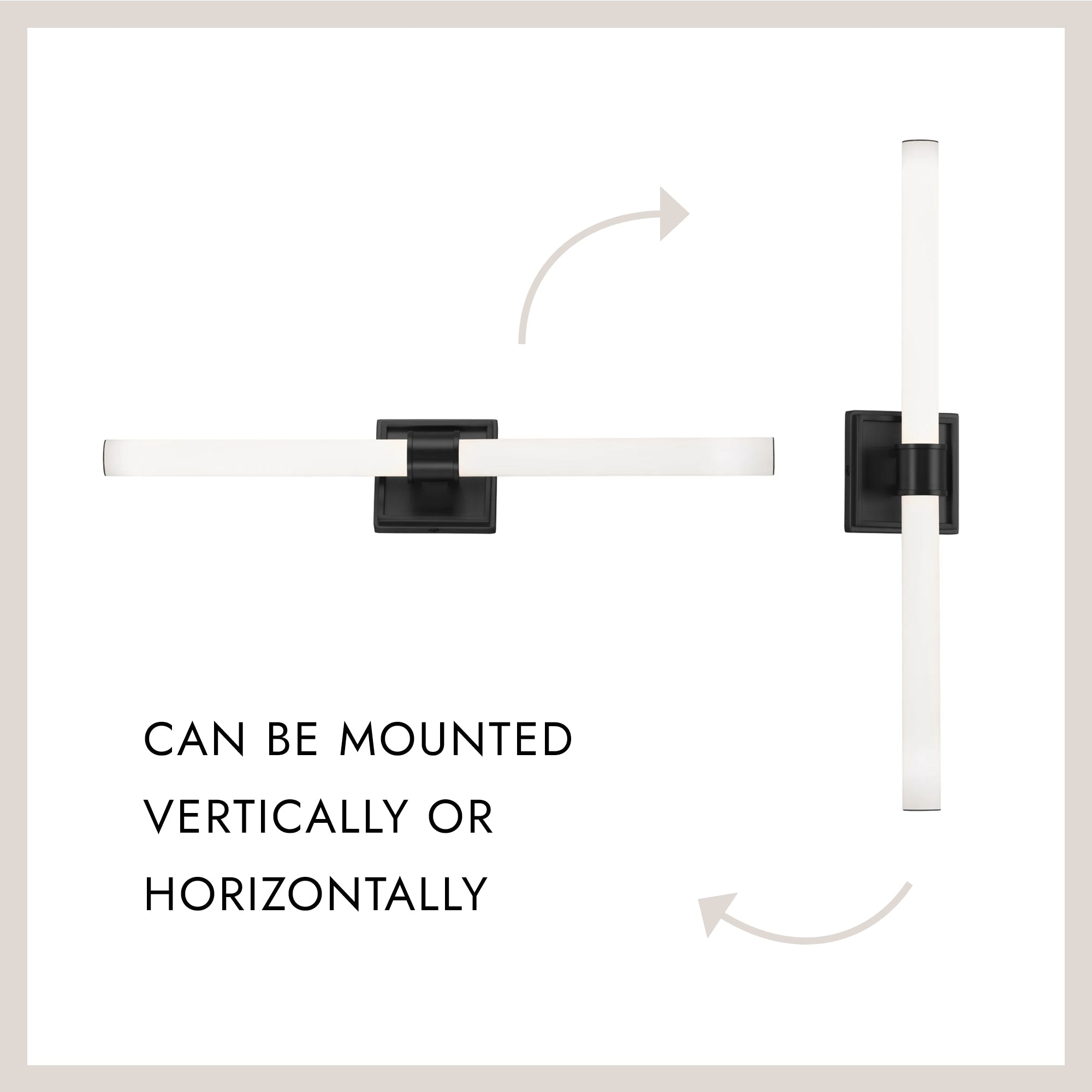 A glowing tube meets a square mount with a slim metal band at the center, creating an LED vanity light with calm precision. Light travels the full length of the lens, softening shadows across a mirror or wall. From the side or head-on, the edges stay crisp and centered.