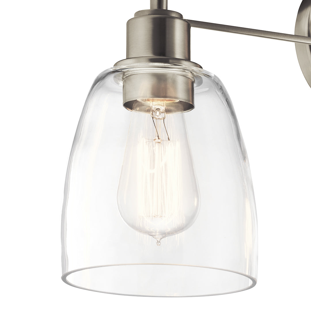 - Clear glass showcases bulbs and keeps sightlines clear in cozier bathrooms