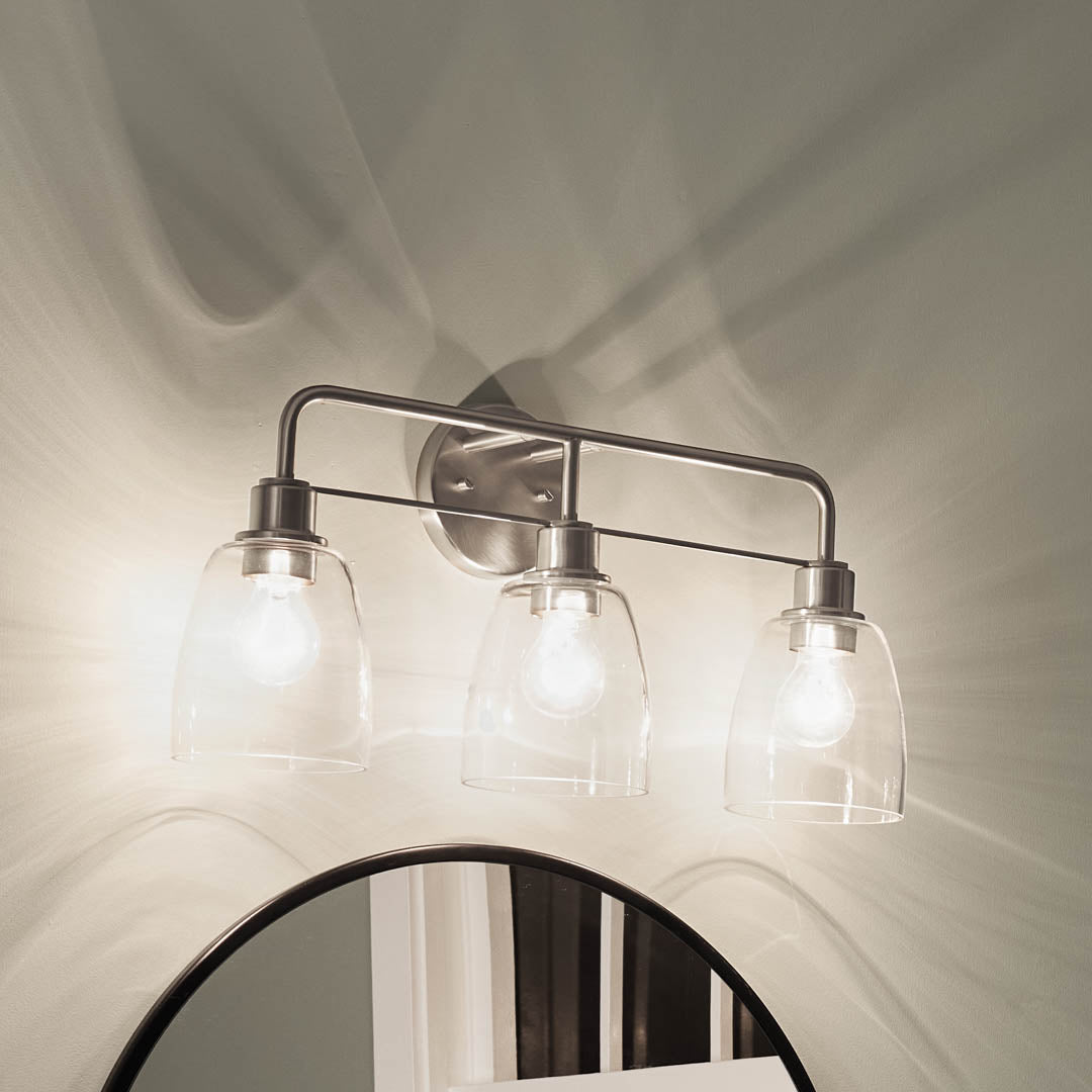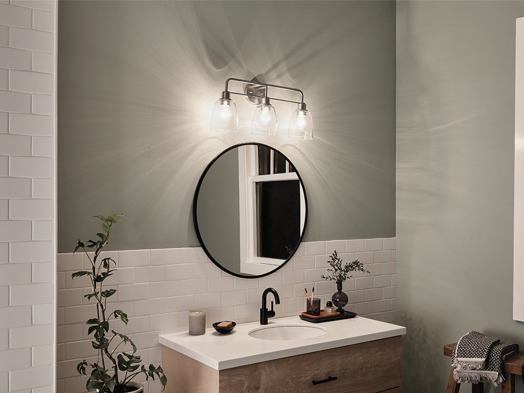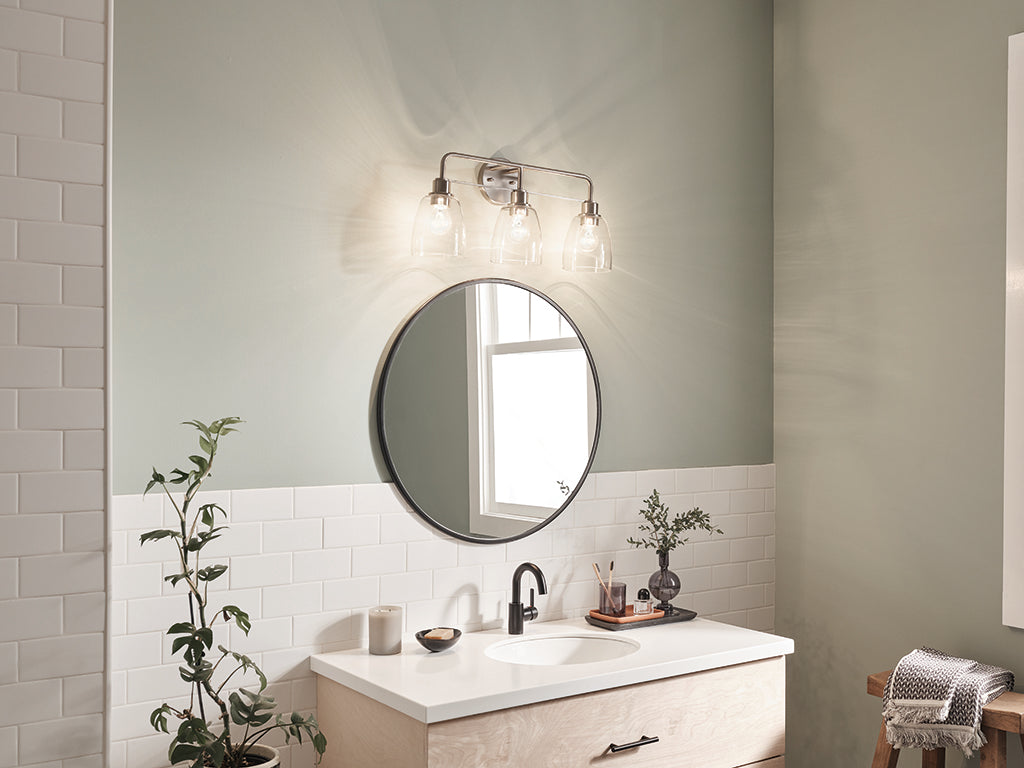 - A three-light vanity light with clear glass lends airy brightness for morning routines