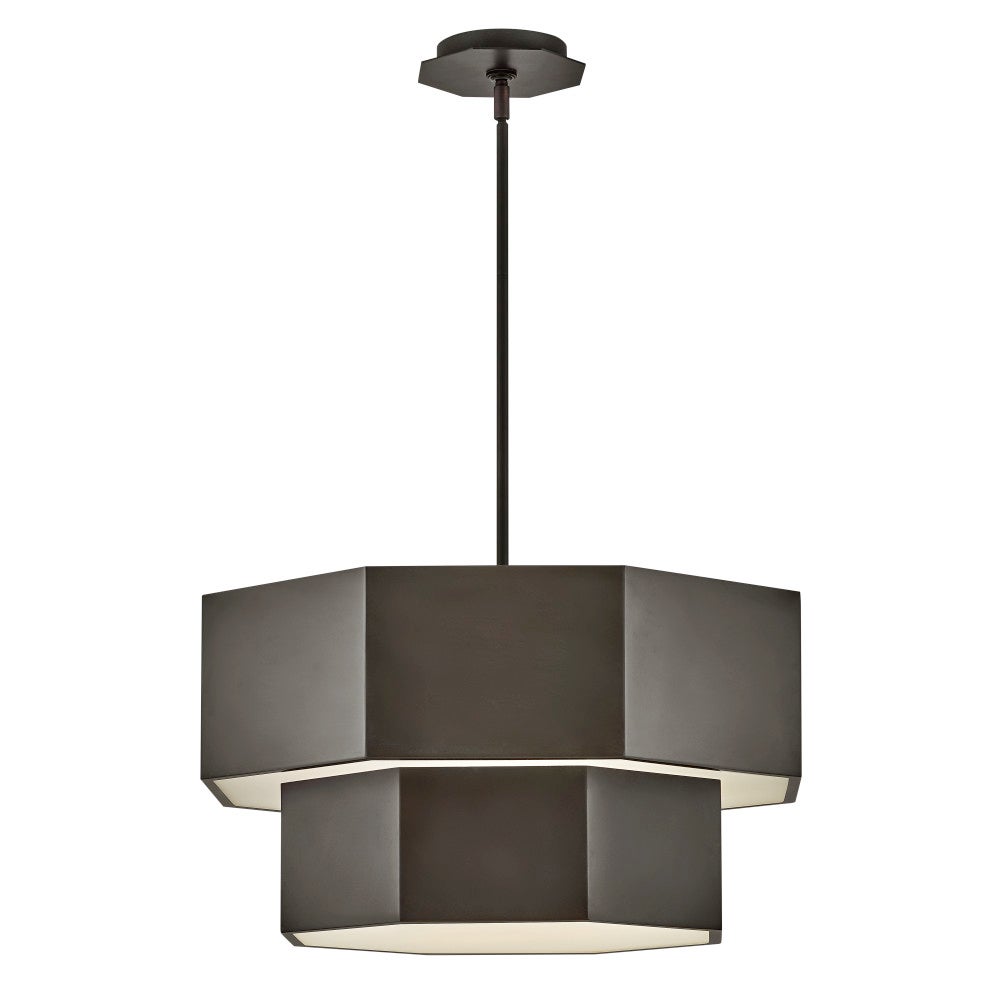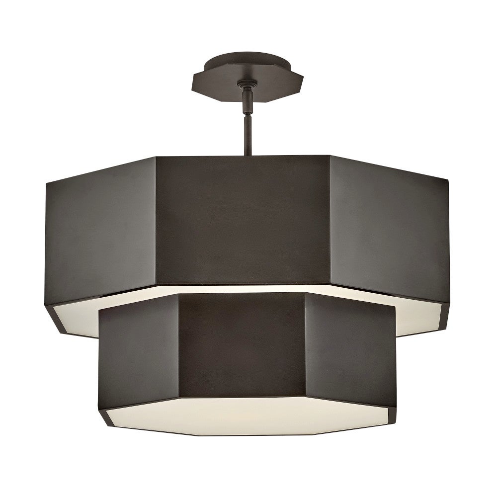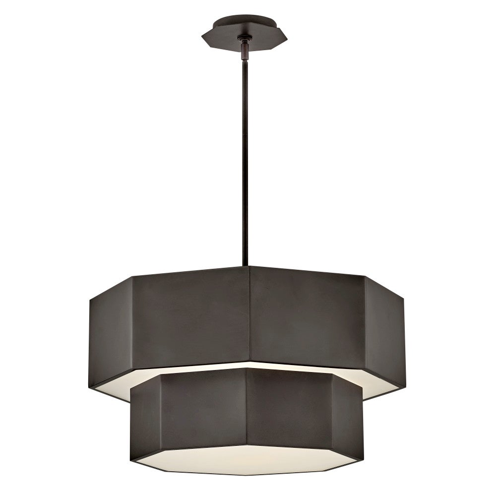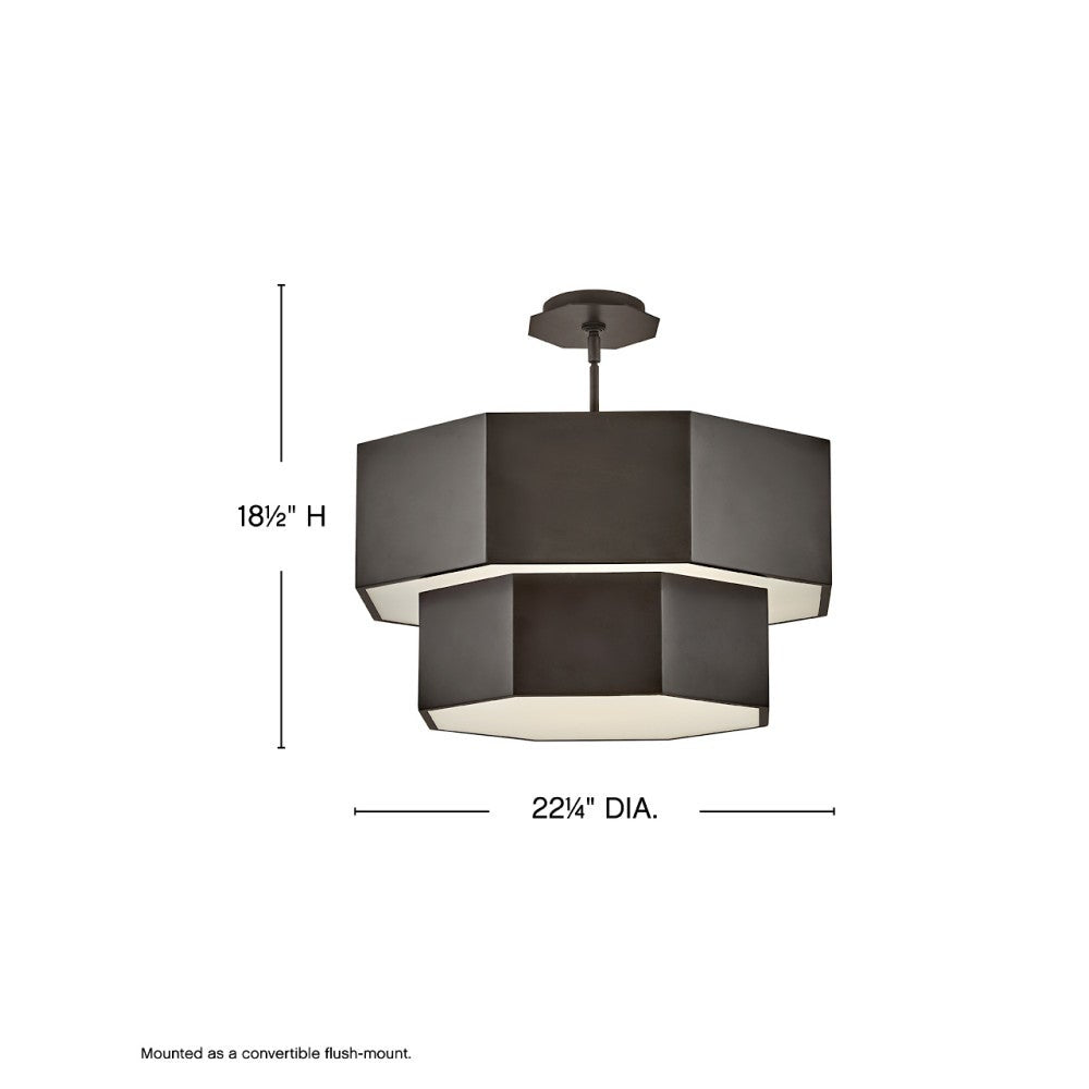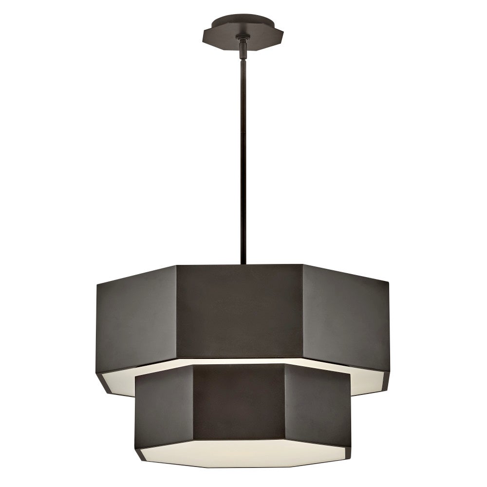 Intriguing angles highlight the modern sophistication of this hexagonal convertible chandelier. Suited as a pendant or semi-flush mount fixture, it enhances with a two-tiered silhouette and hexagonal layers, each augmented with etched glass that softly diffuses illumination. A chic finish completes the look, while included down rods provide for easy adaptability for a fixture that hangs on both flat and sloped ceilings.