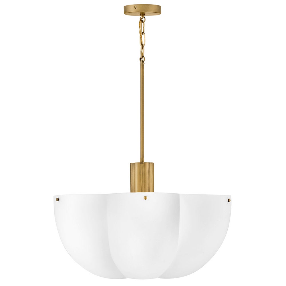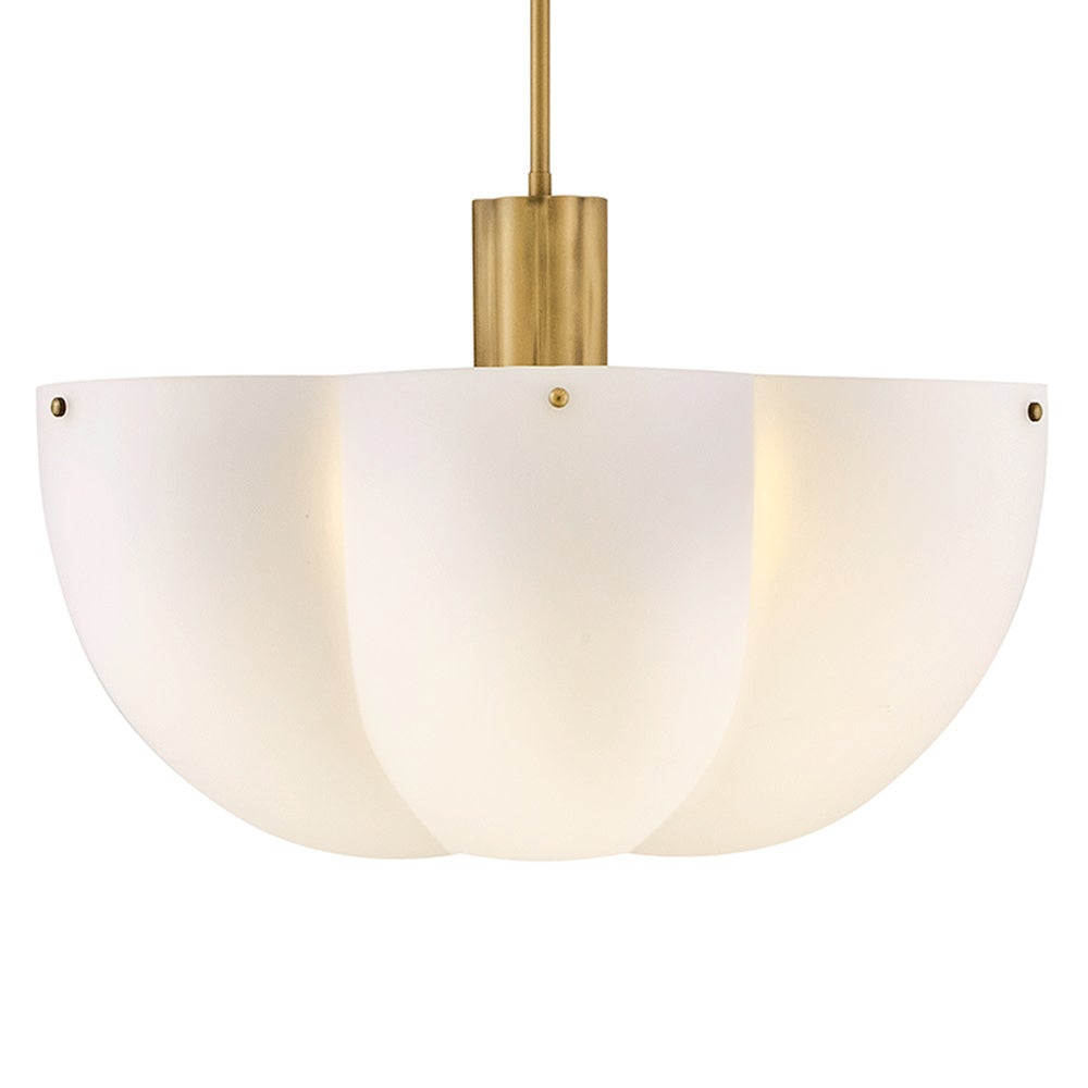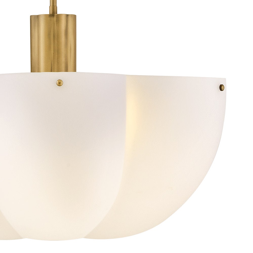 Beautiful hand-blown etched opal glass decorates this transitional chandelier. Delivering a clover-like profile, its rich character and inviting illumination are right at home over a living or dining room. The pendant includes multiple down rods for custom length, and features a warm heritage brass finish that lends gravitas to its understated frame. This versatile fixture can be hung on both flat and sloped ceilings to equally impactful effect.