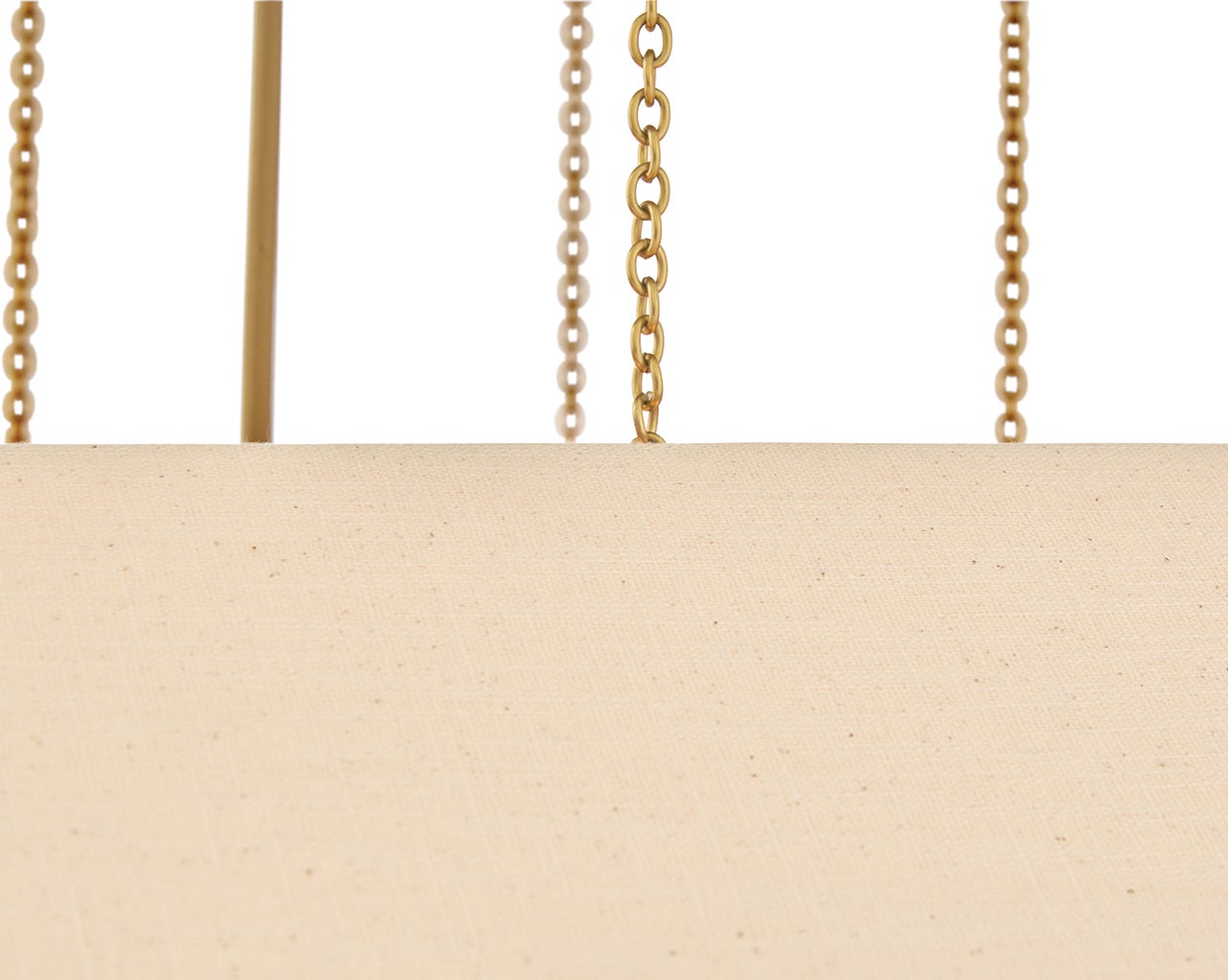 Elegant yet edgy, Lyla’s geometric Oatmeal Linen shade with a textured, wrapped middle band is suspended from refined Lacquered Brass micro-chains – inspired by delicate jewelry designs. A Lacquered Brass canopy, dimmable lamping, and etched white glass diffuser add subtle warmth and a sophisticated atmosphere to the surrounding space.