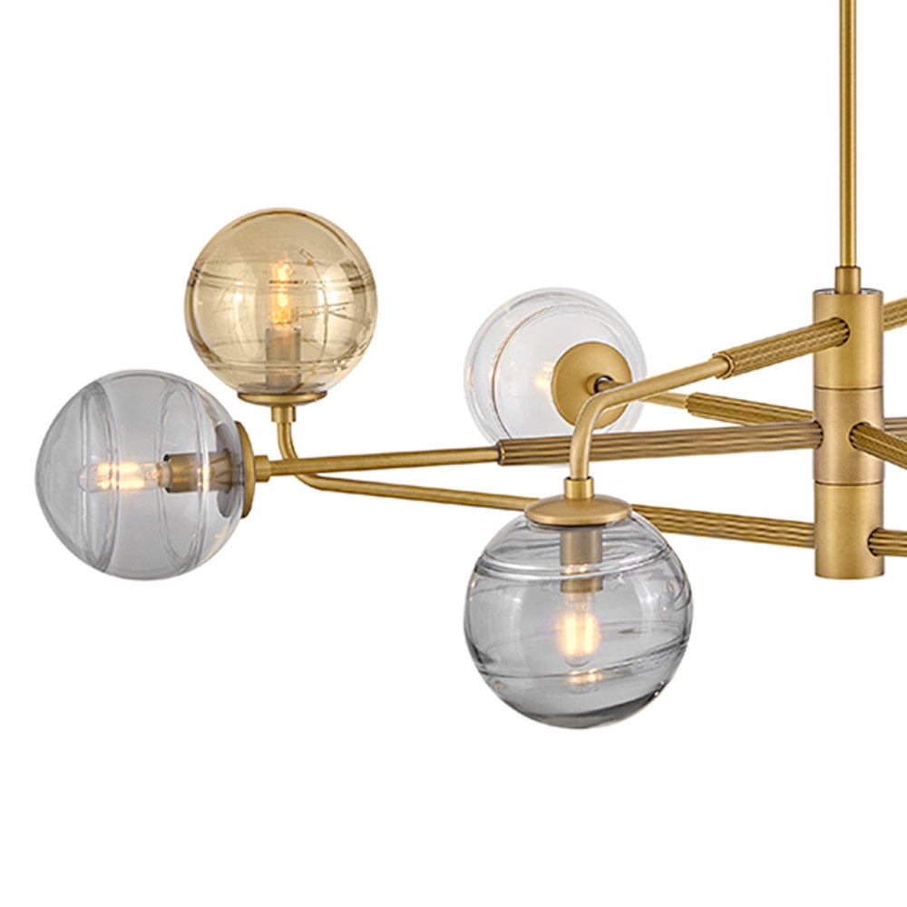Artfully combining unexpected materials, Oberon's ribbed stems create a tailored, transitional silhouette. Delicate swirls detail spherical shades in multicolored glass.