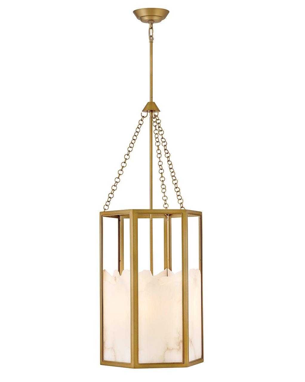 Inspired by snowy mountain peaks, Veleta’s natural alabaster shade with jagged top edges is showcased by a geometric Lacquered Brass frame. Truly one-of-a-kind graining, color variations, and organically formed textures make each Veleta fixture genuinely unique.