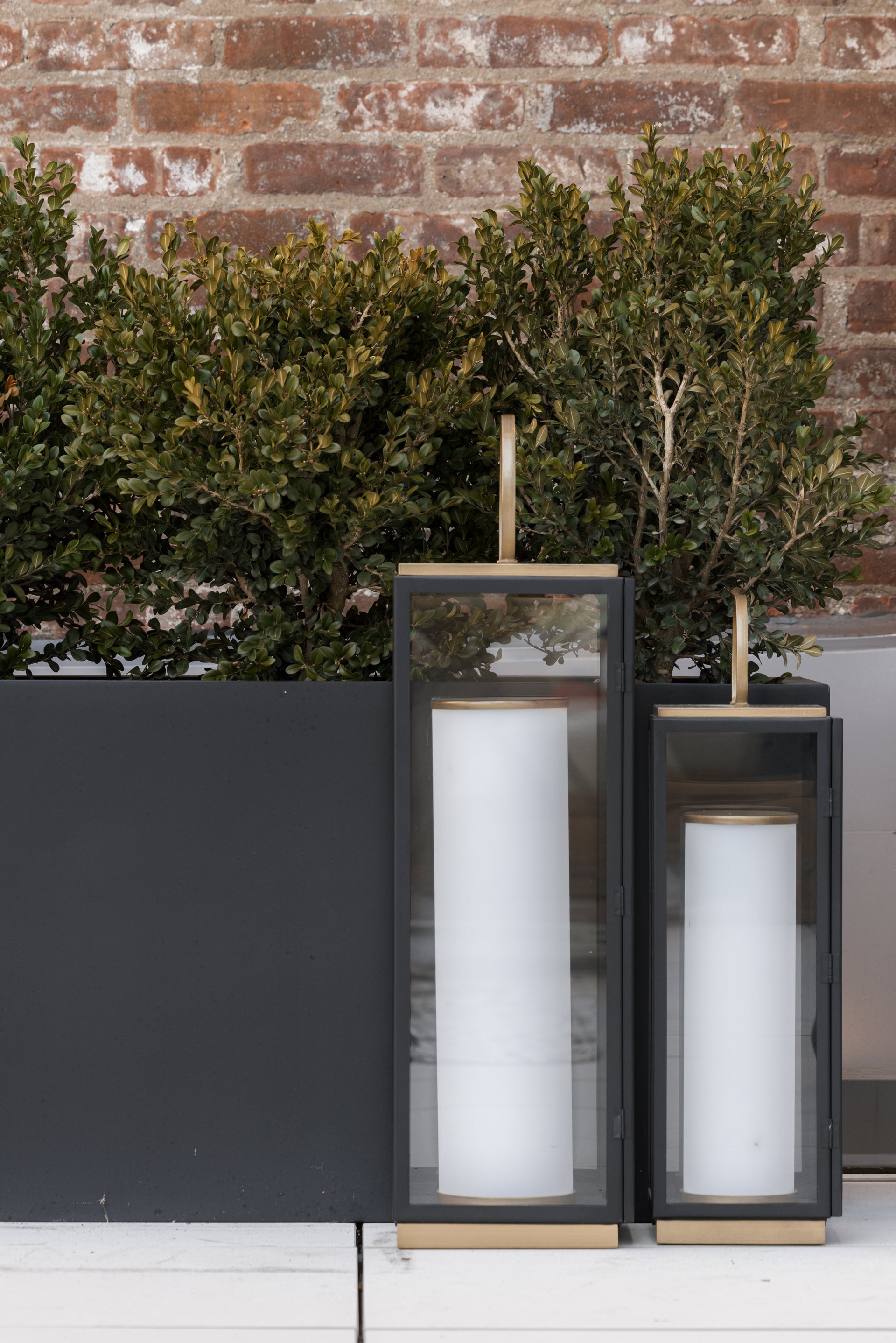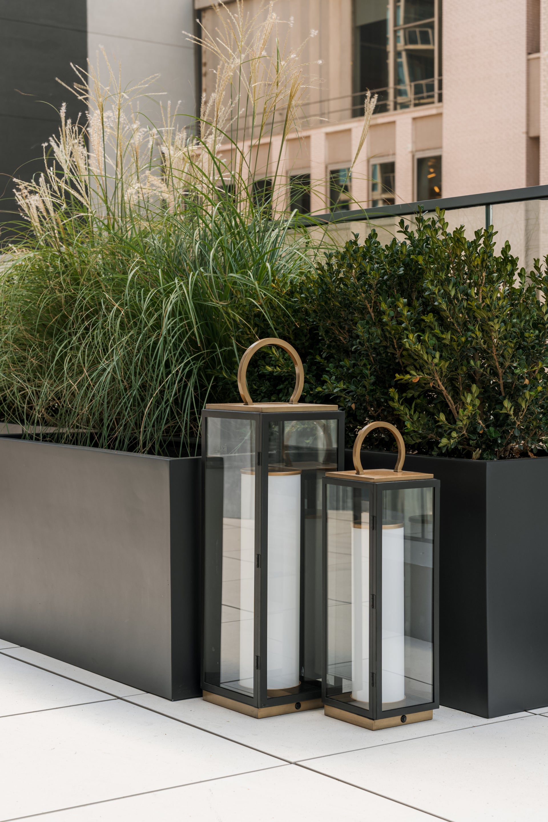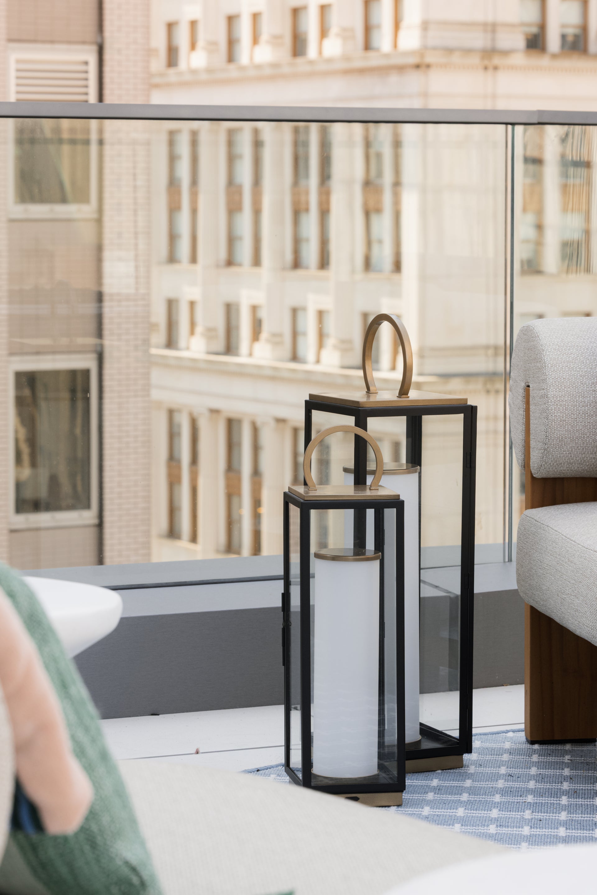 A distinctive ring detail calls to mind portable lanterns of a bygone era, bringing robust character to this outdoor table lamp. Elongated glass panes showcase an interior cylinder shade that casts a soft glow, perfect for ambiance while enjoying a backyard barbecue or evening on the patio. A finish combination of textured black and patina brass offers wonderful warmth and contrast, ensuring a sophisticated look and feel.