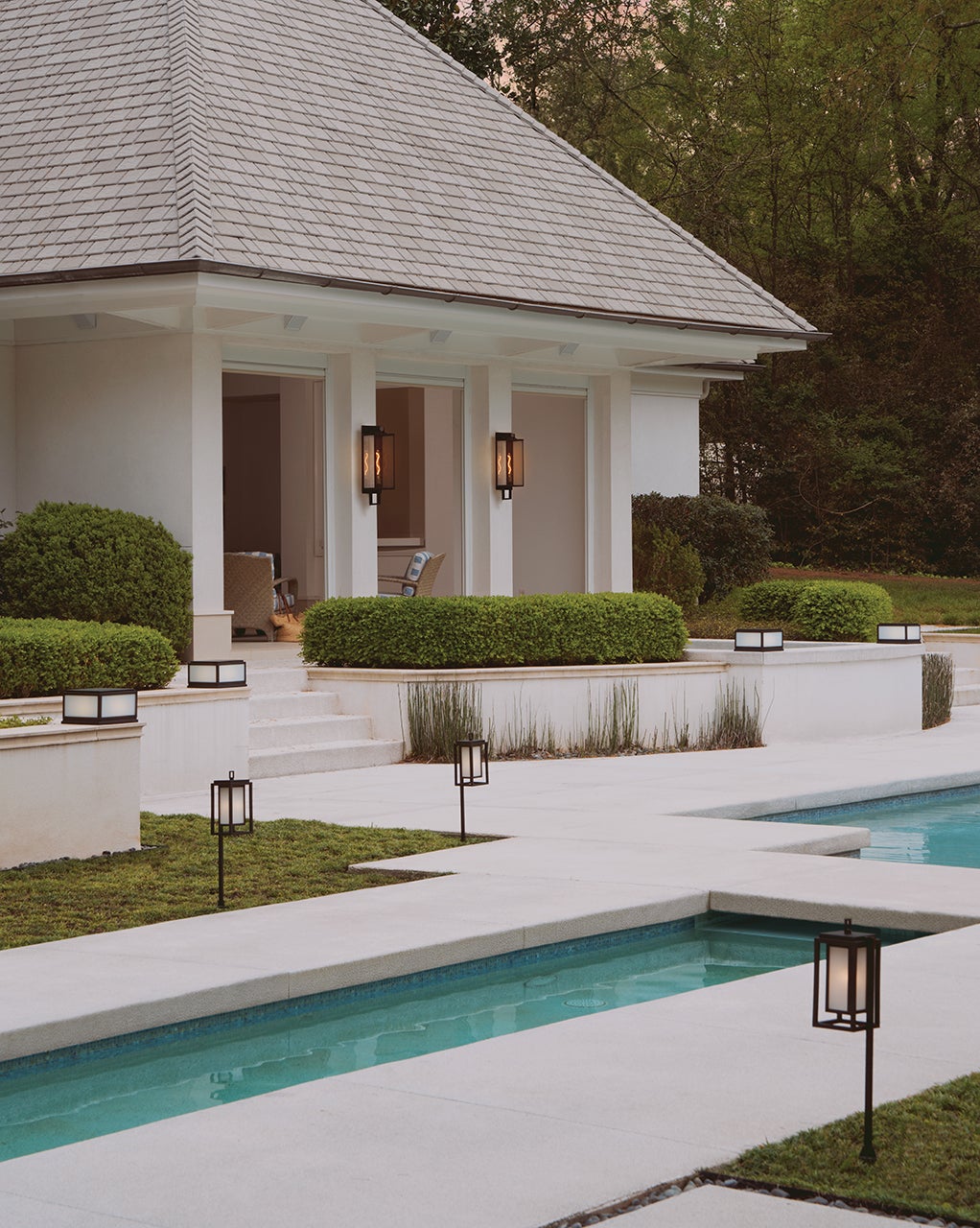 Kona brings a streamlined, contemporary feel to outdoor settings with its clean-cut profile and architectural clarity. Its hand-welded aluminum frame and interchangeable glass panels offer both visual interest and flexibility in styling. With its crisp geometry and modern warmth, Kona adds a refined, welcoming presence to pier or post installations.