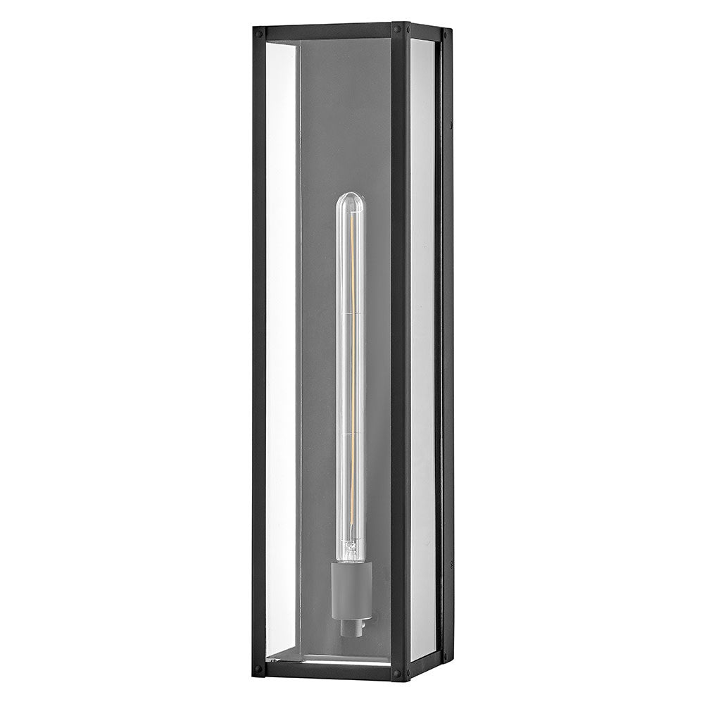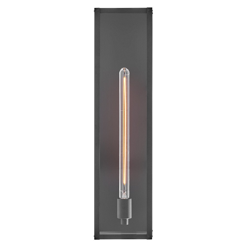 The larger Kona wall lantern offers an elevated, architectural statement with its tall profile and open, contemporary form. Clear glass panels showcase the interior illumination beautifully, while the hand-welded frame reinforces its crisp modern character. Its poised proportions and thoughtful finishing touches make Kona a refined option for enhancing exterior facades.