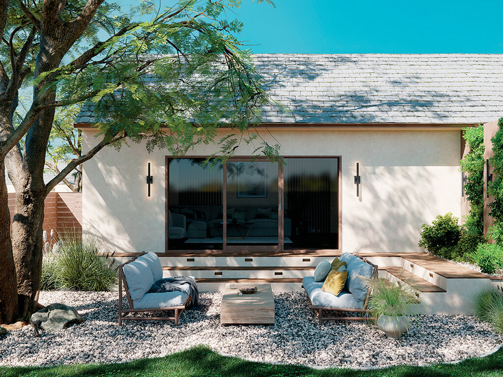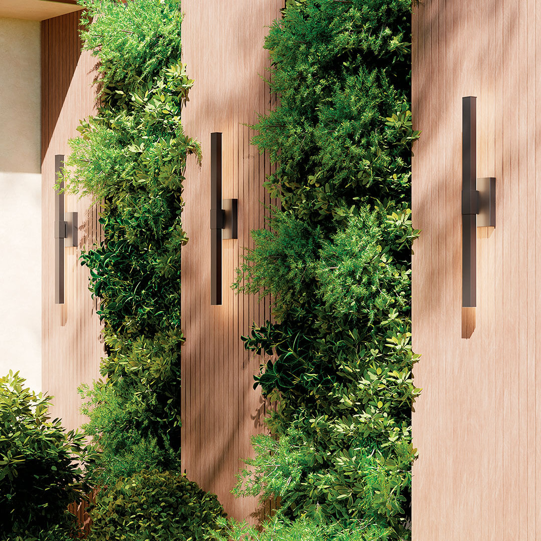 - A modern LED wall sconce in textured black elevates facades with sculptural minimalism