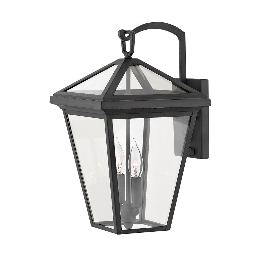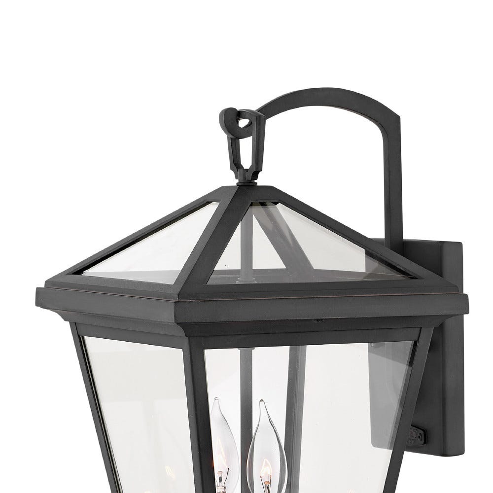 - A top loop and hook detail adds presence to this transitional outdoor wall lantern