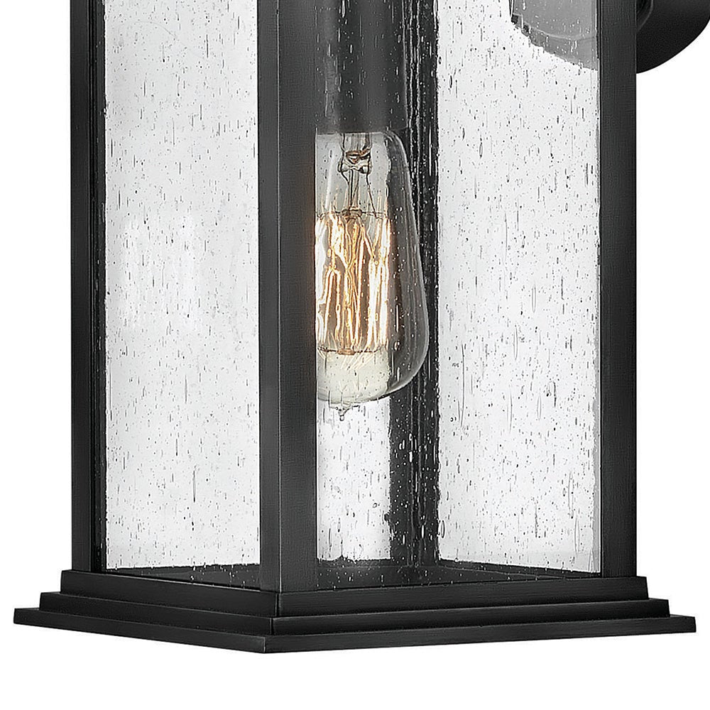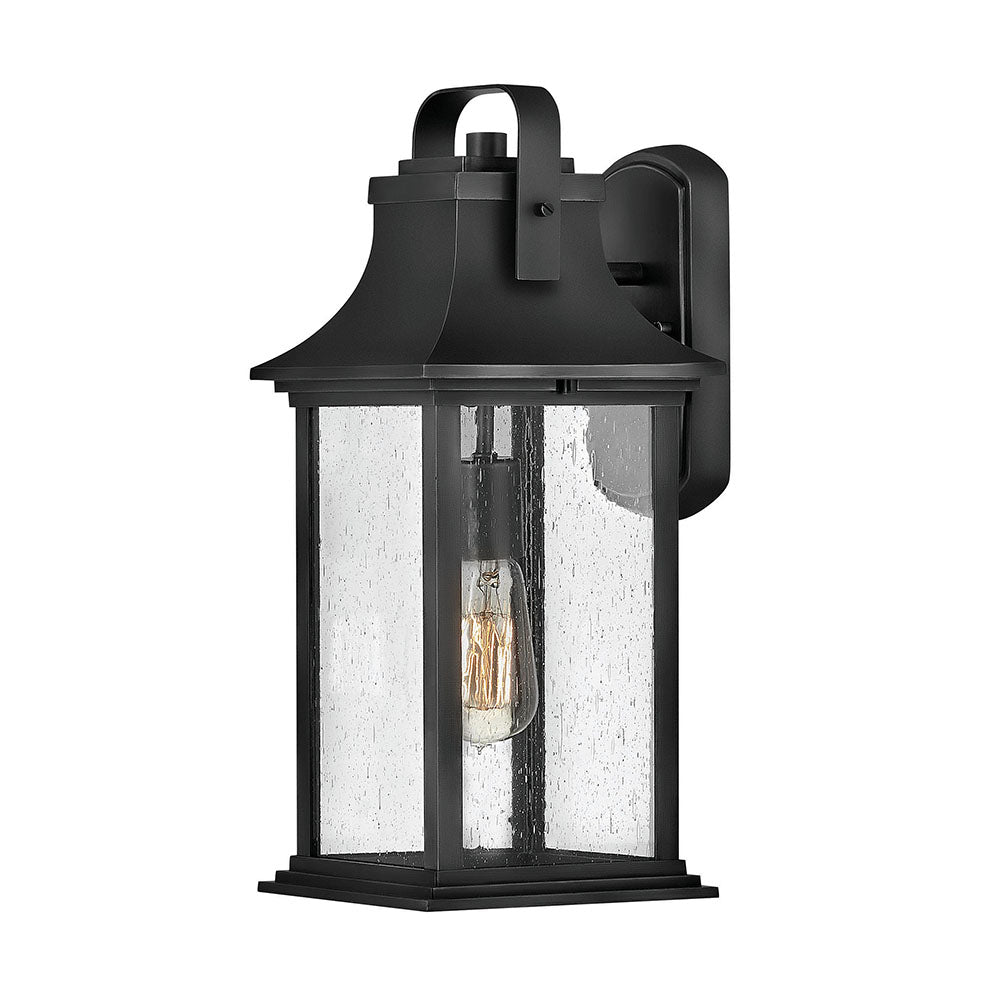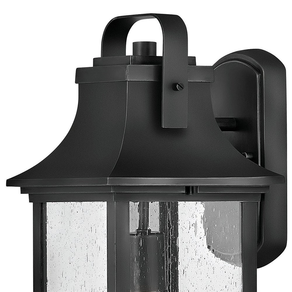 Brighten your exterior spaces with the updated charm and character of this outdoor wall lantern. In a chic finish suited to use outdoors, it features aluminum construction paired with seedy glass panels that diffuse light and add artisan appeal. The oversized handle detail and sweeping roof line of the lantern add heritage details, while its overall presentation reads as fresh and on-trend on an inviting home. Add a pair to either side of a front entry to ensure welcoming curb appeal.