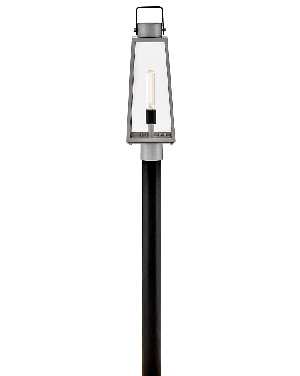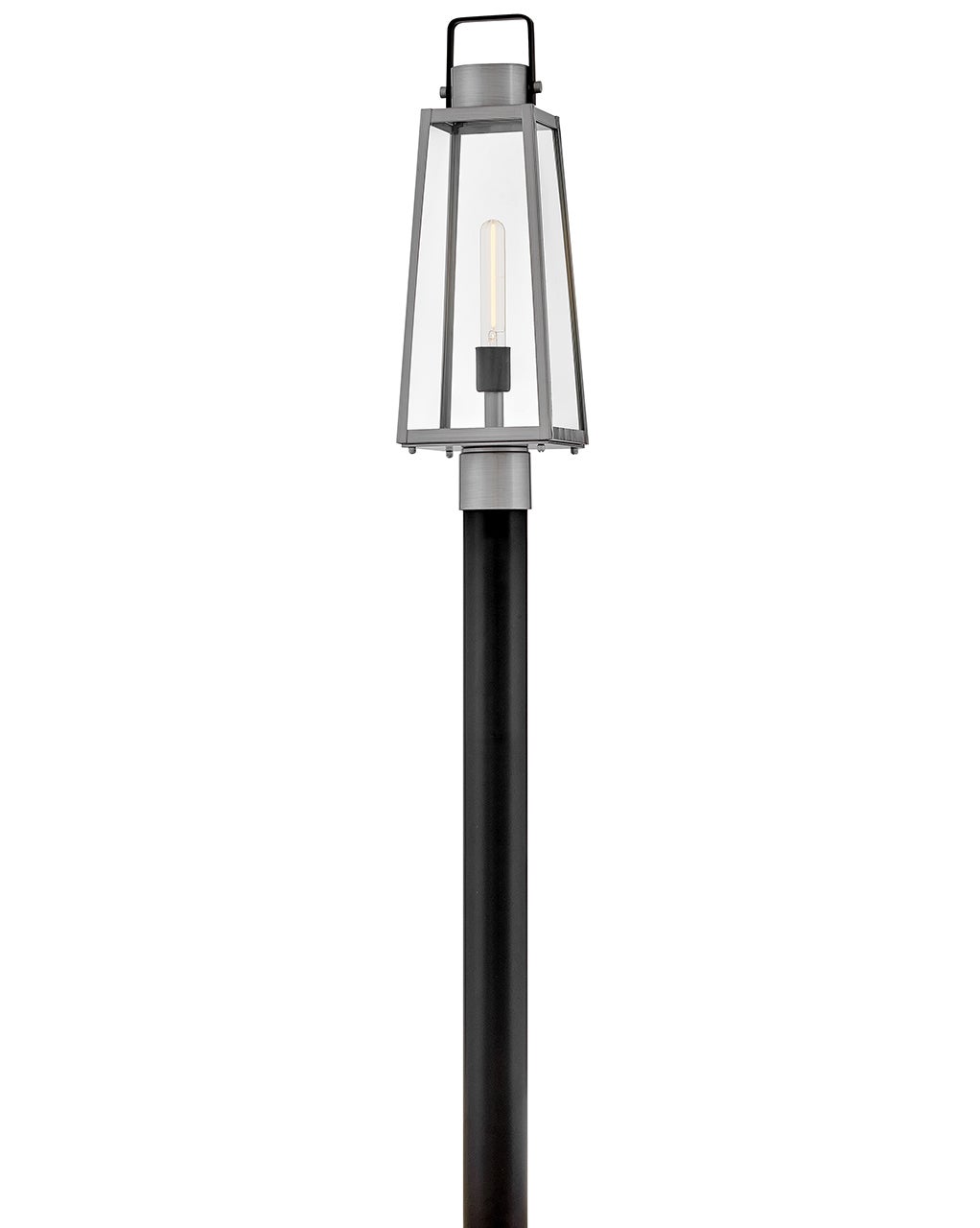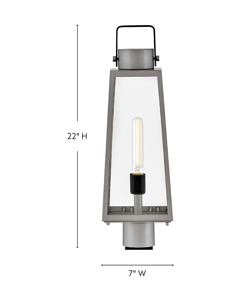 • Modern outdoor post lantern that merges clean geometry with radiant clear glass