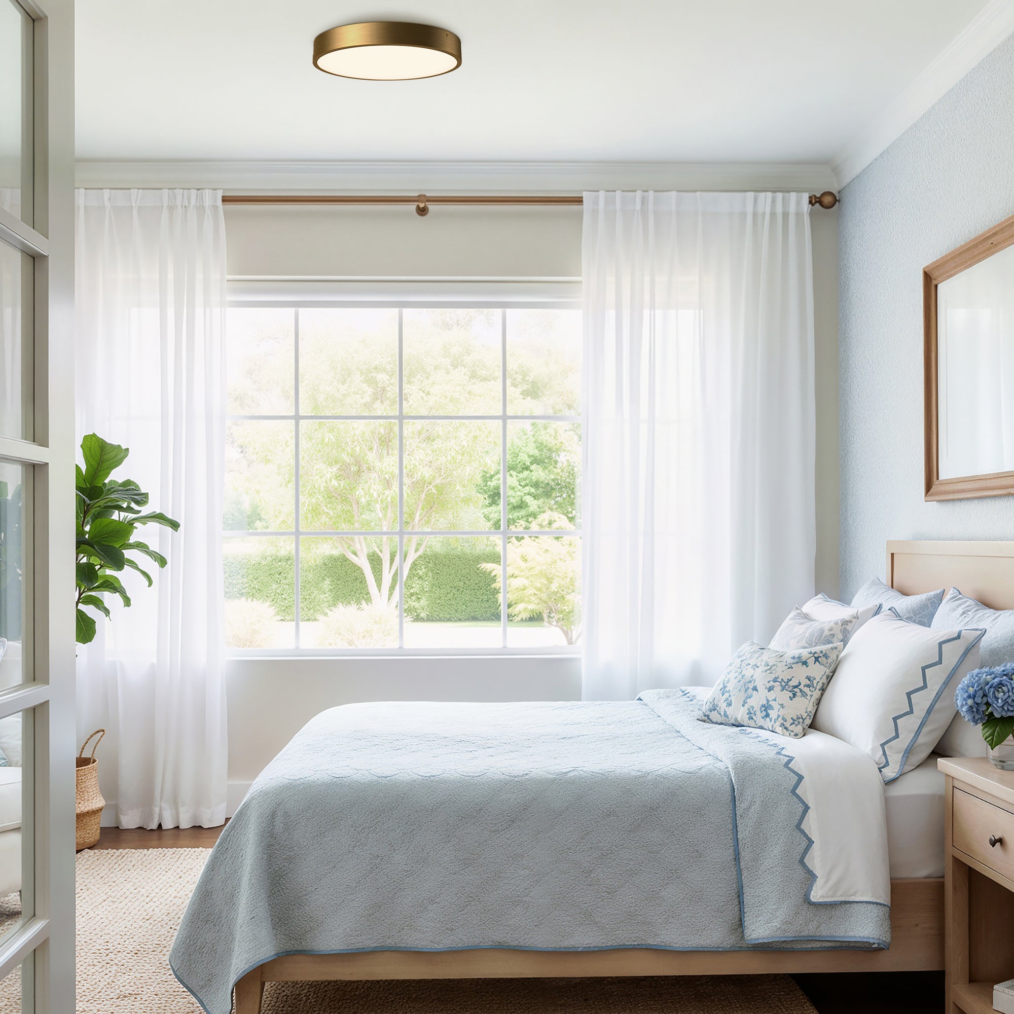 - An LED flush mount creates a clean luminous disc for contemporary spaces