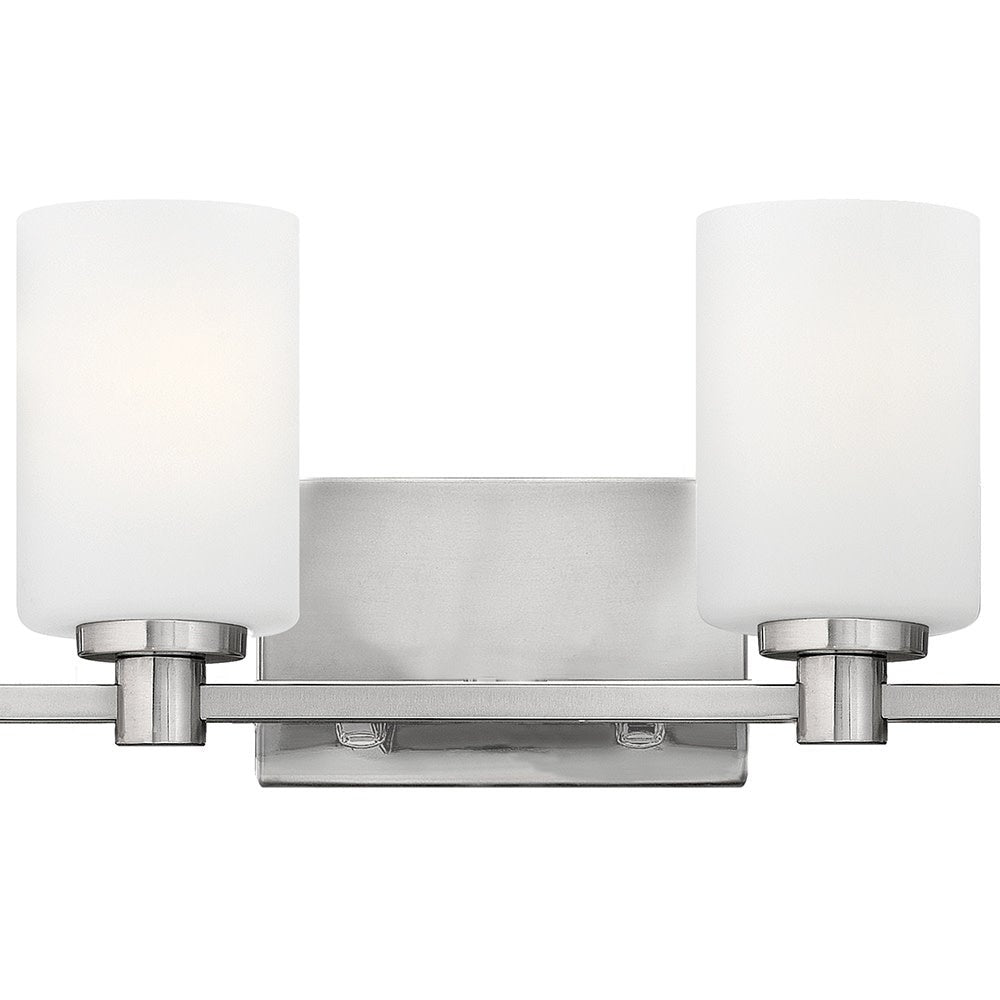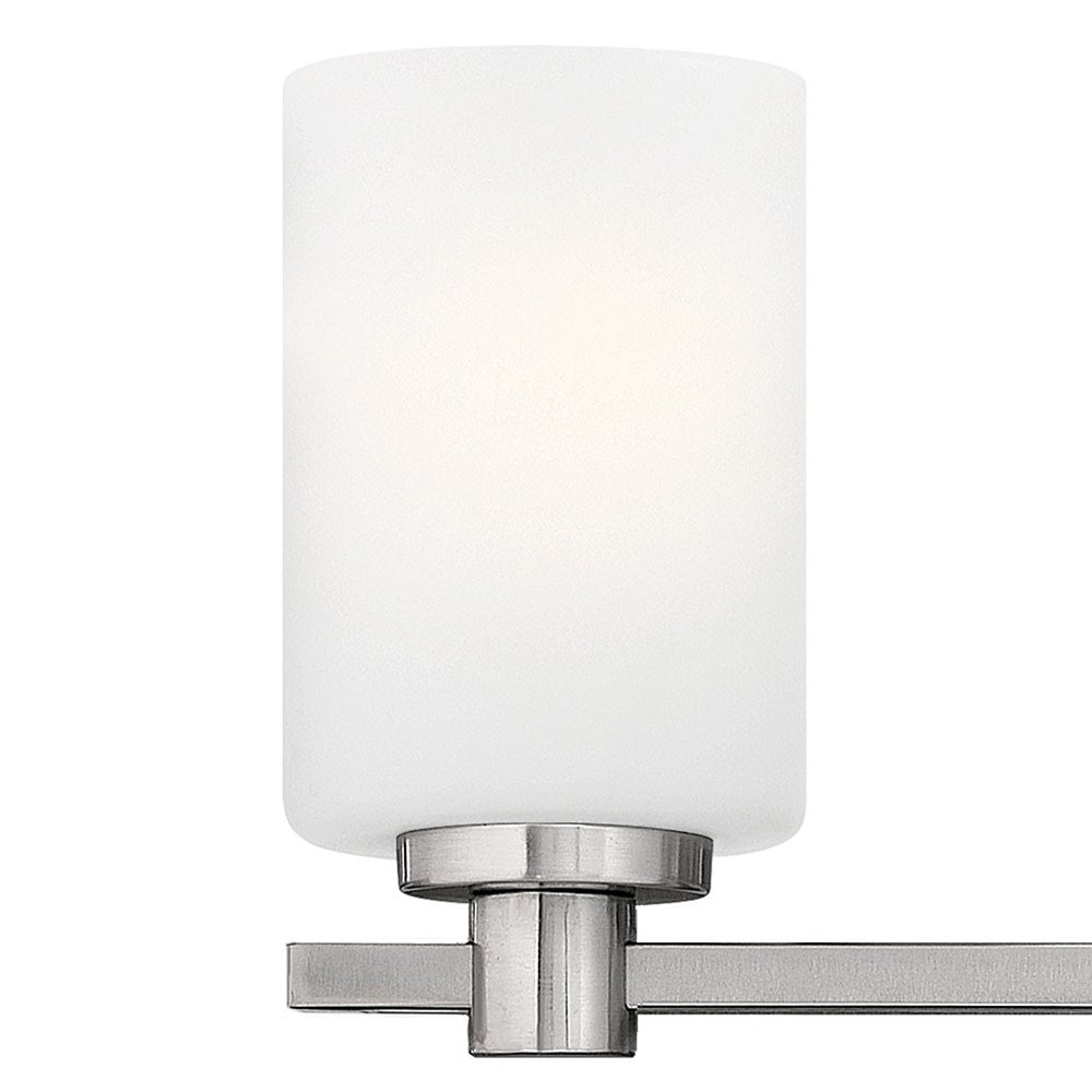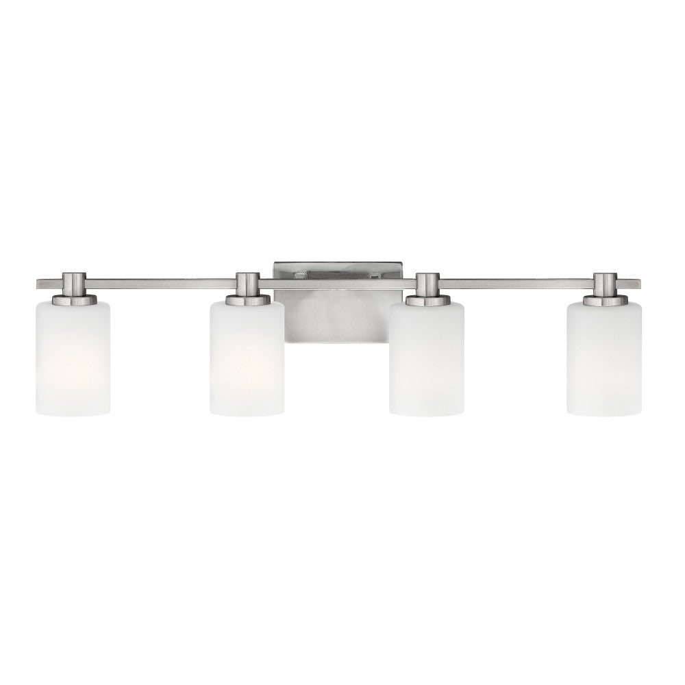 For large families and wide counters, this modern four-light bathroom vanity brings a confident sweep of illumination that spans the full width of the mirror. Four cylinders of opal glass stand in a precise row, and the metal bar that anchors them remains slender and composed, so the fixture suits both simple painted walls and more elaborate stone or tile backdrops. Mounted over a double vanity, it helps organize the entire wall, aligning with sinks and cabinetry so the space feels thoughtfully arranged. Its refined simplicity makes it an easy upgrade that instantly refreshes an existing bath.