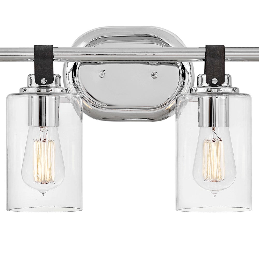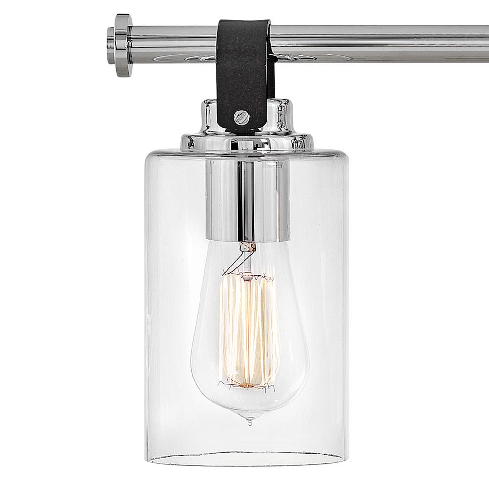 - Equestrian-style strap and clear glass shades merge warmth and clarity for a statement that still feels inviting