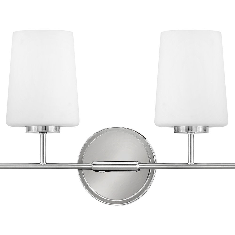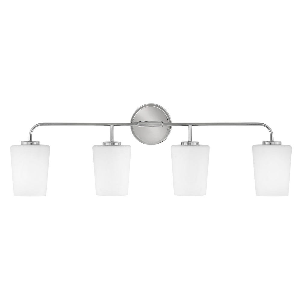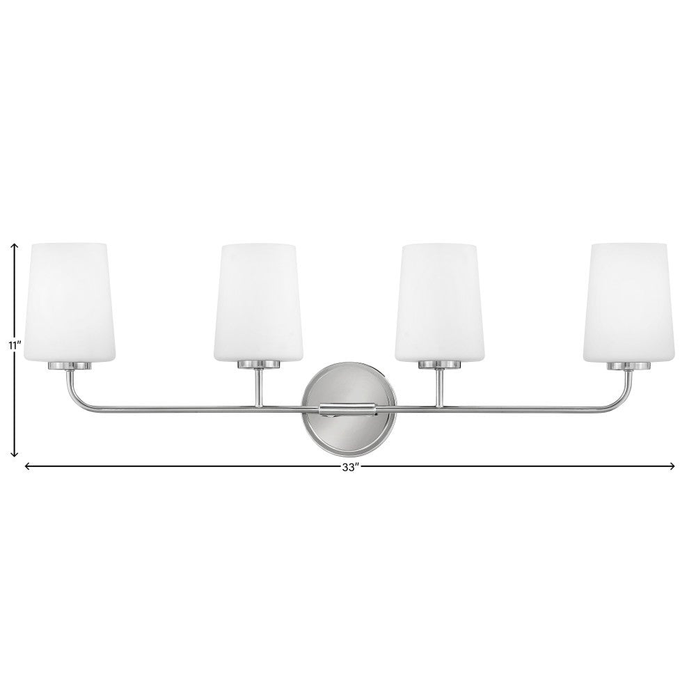 - A contemporary four-light vanity wall light floods wide counters with balanced, flattering brightness