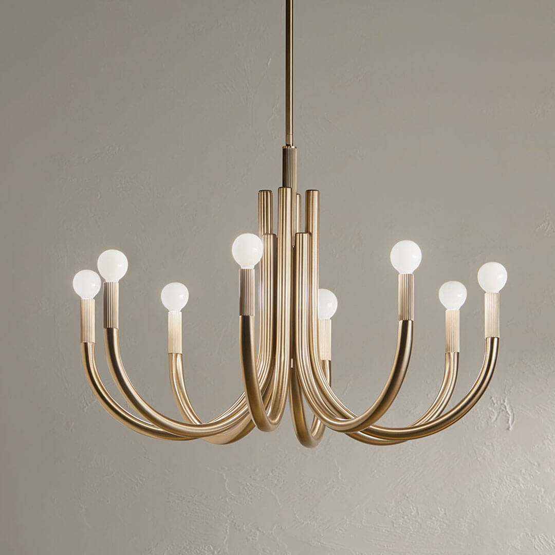 • A contemporary eight-light chandelier brings sculptural poise to daily living