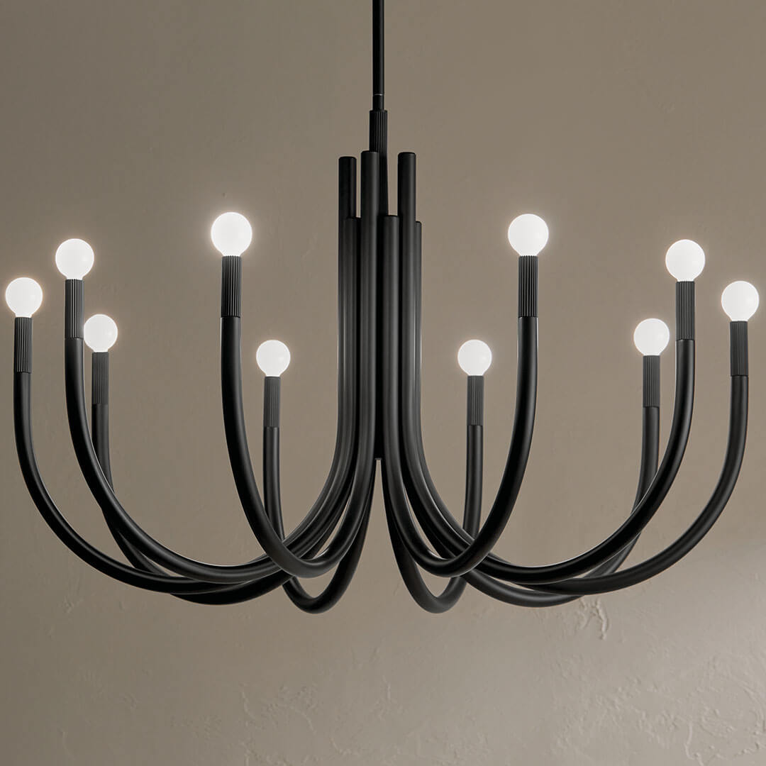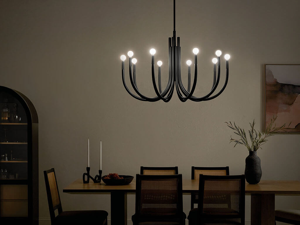 - A contemporary ten-light chandelier surrounds gatherings with balanced illumination