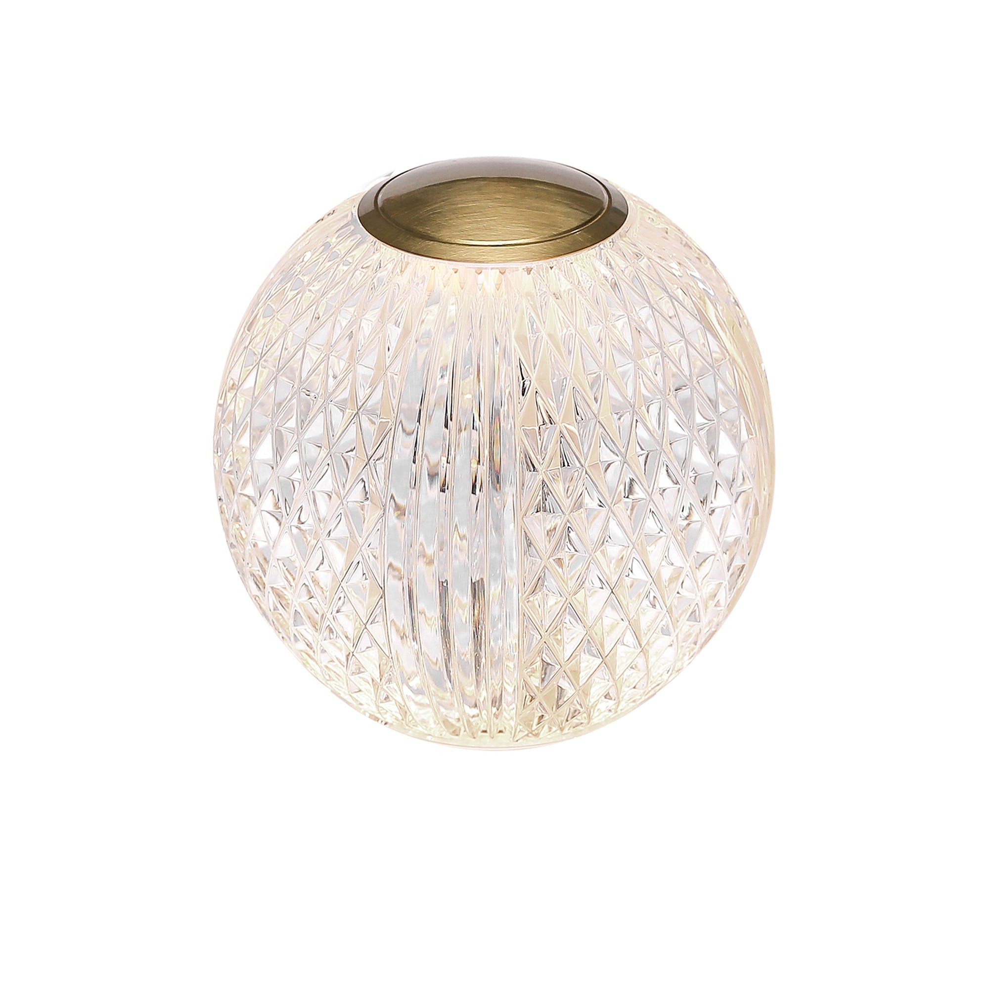 - A portable LED table lamp with an unexpected delicate motif featuring textured glass with a metal top