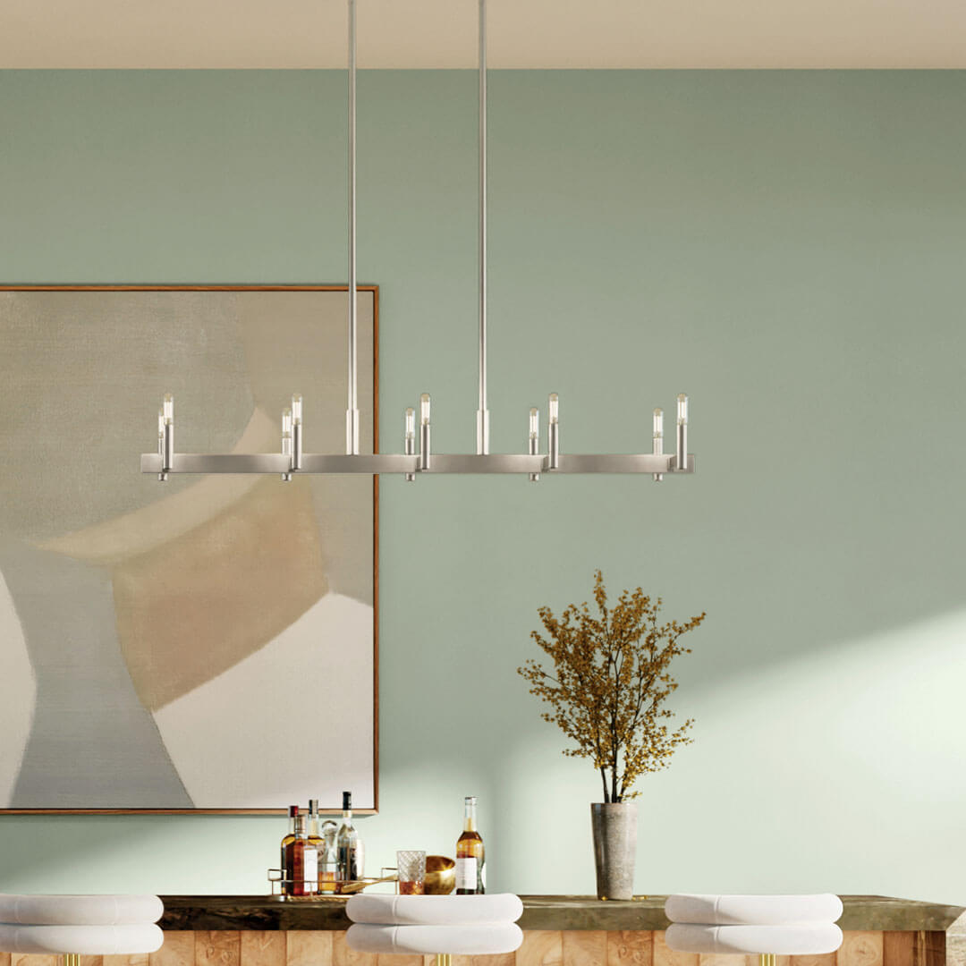 - A modern ten-light island chandelier features a clean-lined silhouette that maximizes impact