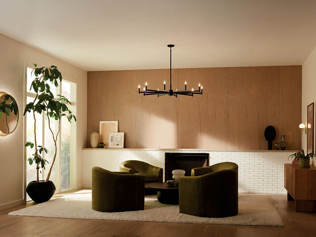 Above a table or seating group, this ten-light starburst spoke chandelier sends slender arms outward from a compact hub to form a clear, memorable shape. The open arrangement preserves views across the room so people and wall art remain present and in focus. Because the bulbs are so easy to change, this fixture can shift from lively sparkle to a more tailored look in a quick swap. When you want a strong silhouette that still feels light in the air, this design performs well in dining and lounge areas.