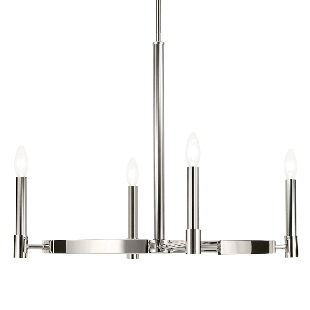 Gaps in a modernized ring silhouette add luxurious appeal to this Art Décor four-light chandelier. Perfect for a cozy space like your den or breakfast nook, it pairs an eye-catching steel frame with a chic finish and slim candle sleeves, to striking effect. Ribbed detailing adds character to the center column, lending overall texture and artistry to a clean-lined, intriguing fixture.