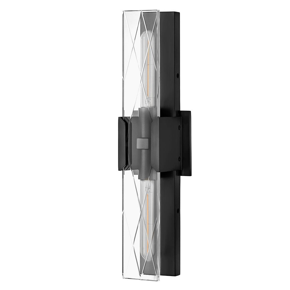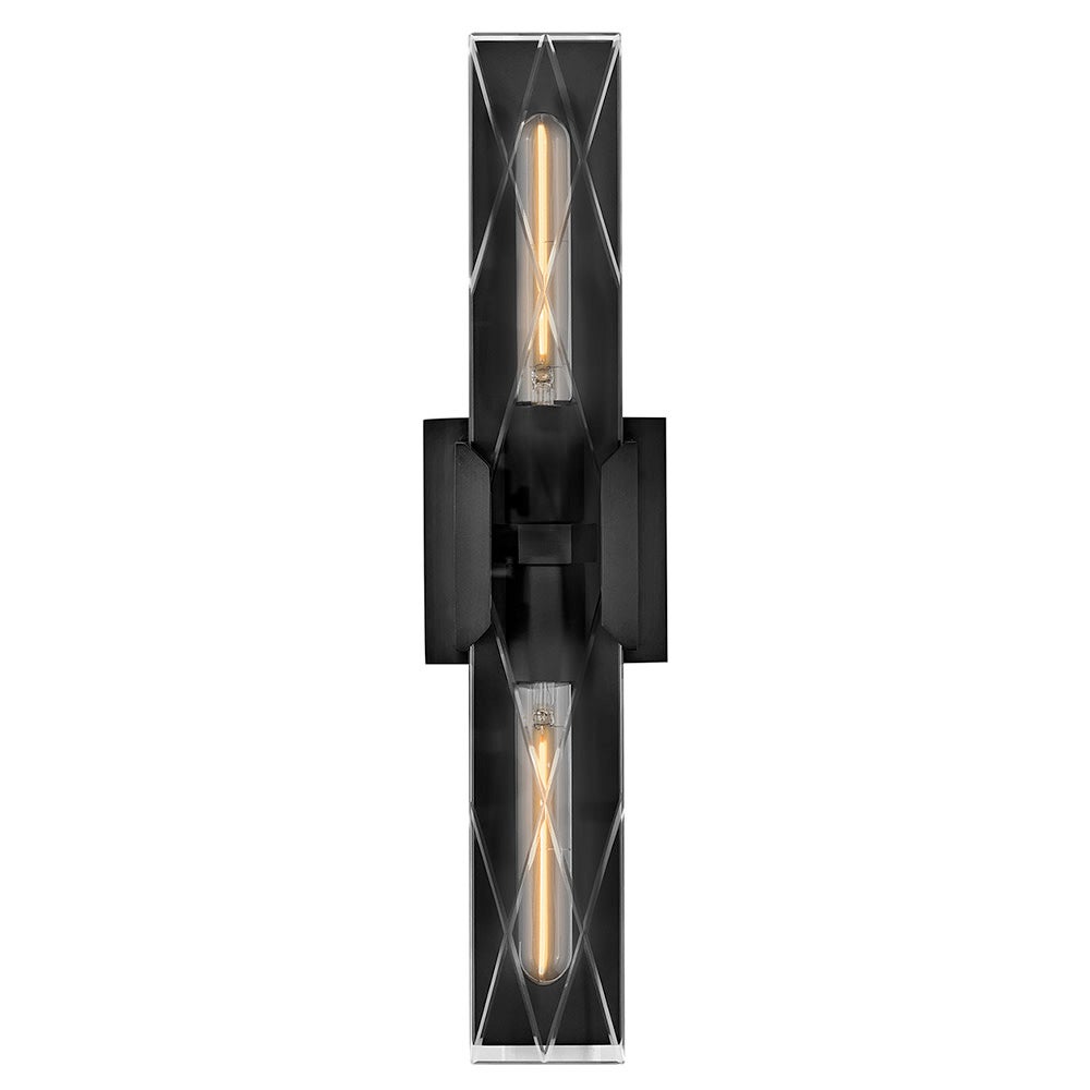 • Polished geometry and sparkling glass create drama with this large two-light wall sconce