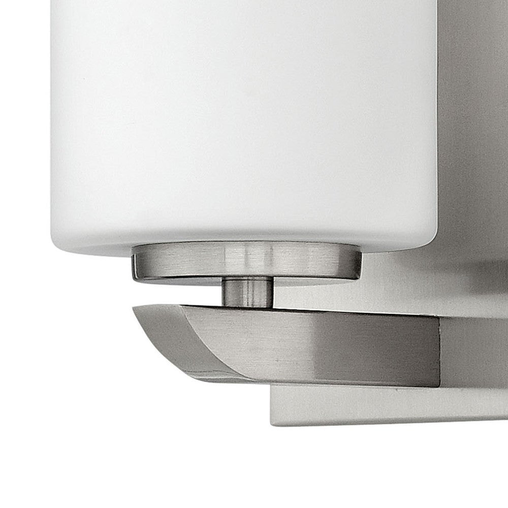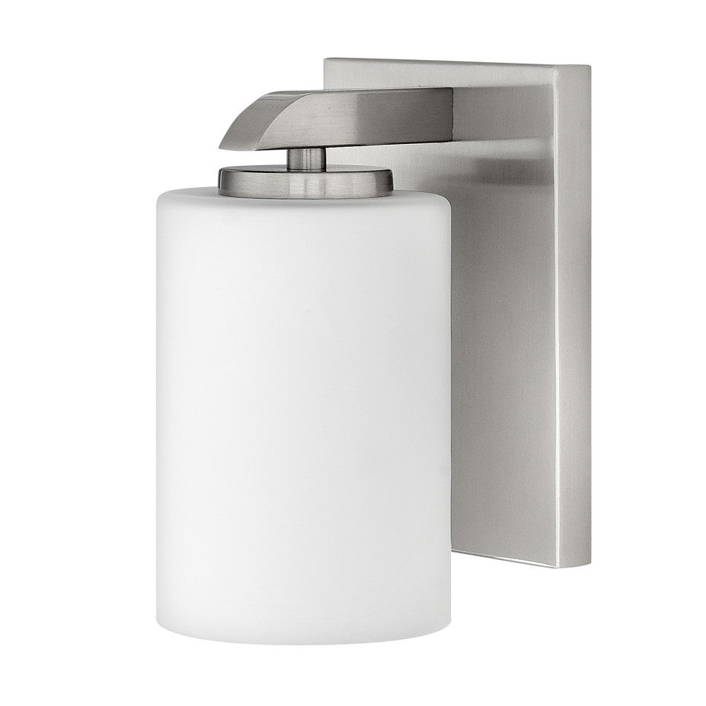 Sized for compact spaces yet rich with detail, this contemporary one-light vanity centers a cylindrical shade on a gently curved metal shelf that extends from a neat backplate. The glass glows from within, creating a soft glow that is especially charming in powder rooms, guest baths, or at the end of a hallway. Its sculpted arm introduces a subtle sense of craftsmanship that pairs nicely with stone counters and simple plumbing fixtures. Place one on each side of a mirror for classic balance or use a single fixture to highlight a small vanity where you want both ambient light and a touch of style.