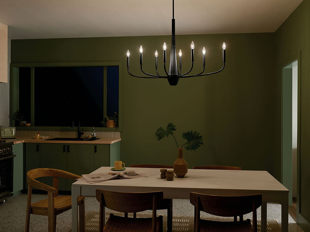 - A modern eight-light chandelier lends sleek elegance to a family dining room or welcoming foyer