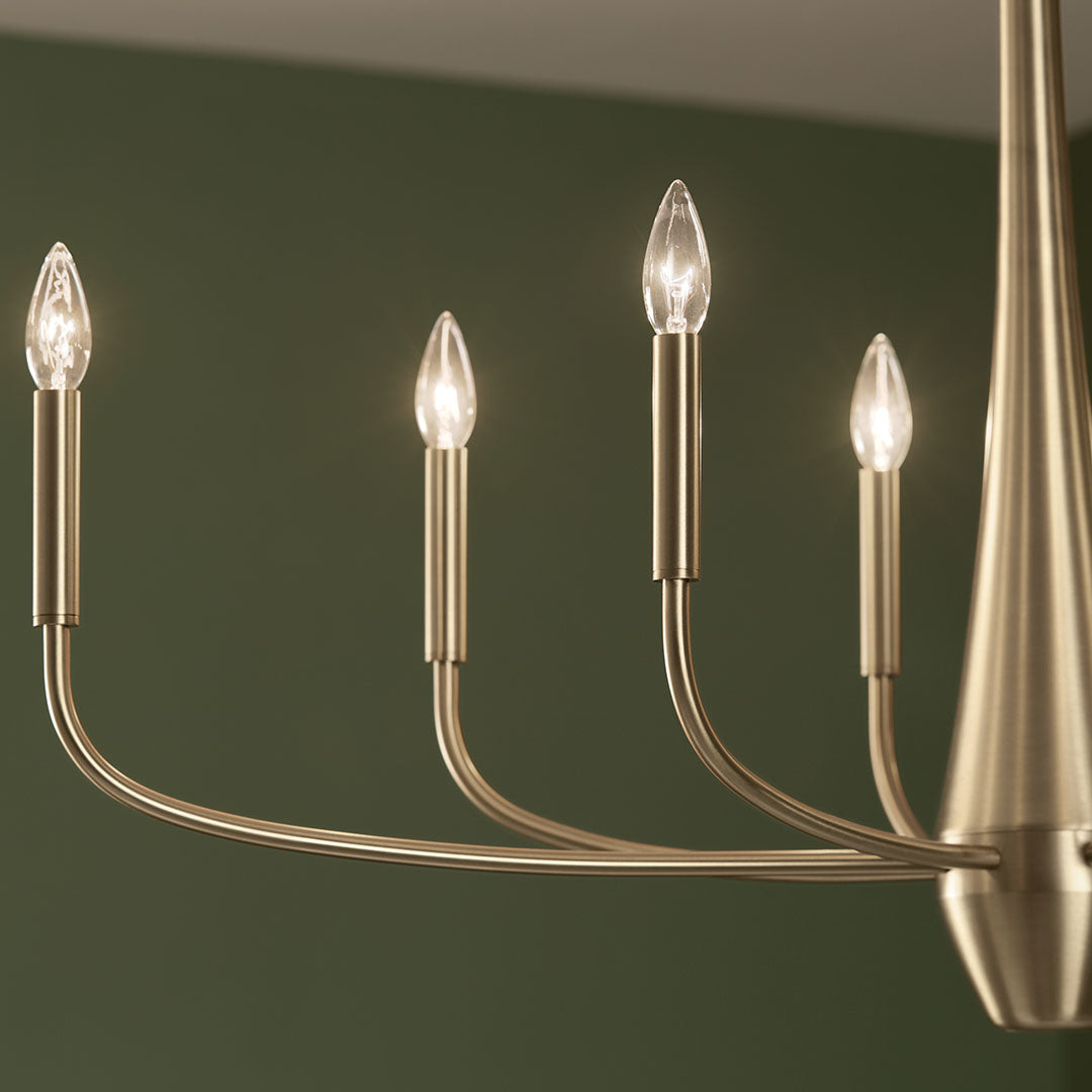- A modern eight-light chandelier lends sleek elegance to a family dining room or welcoming foyer