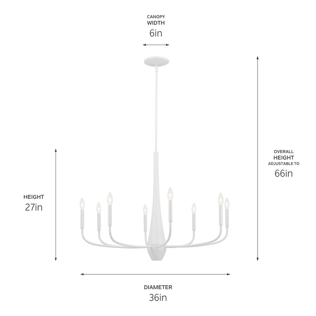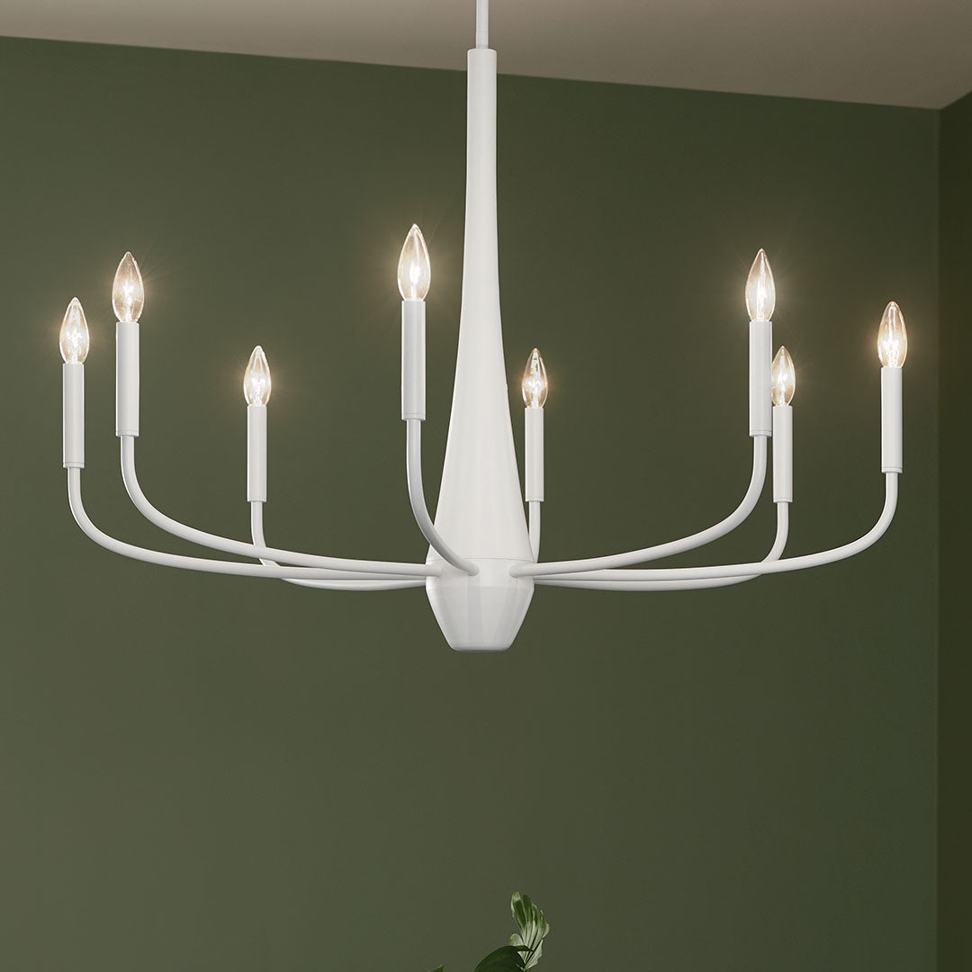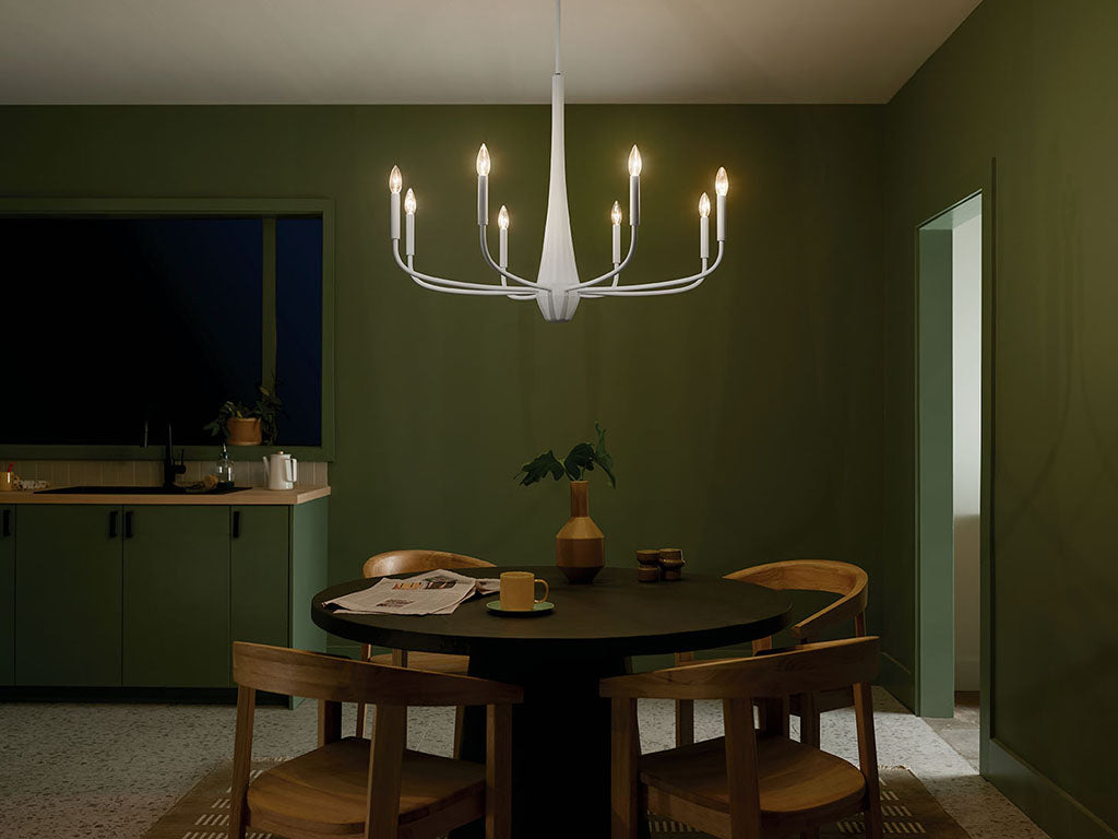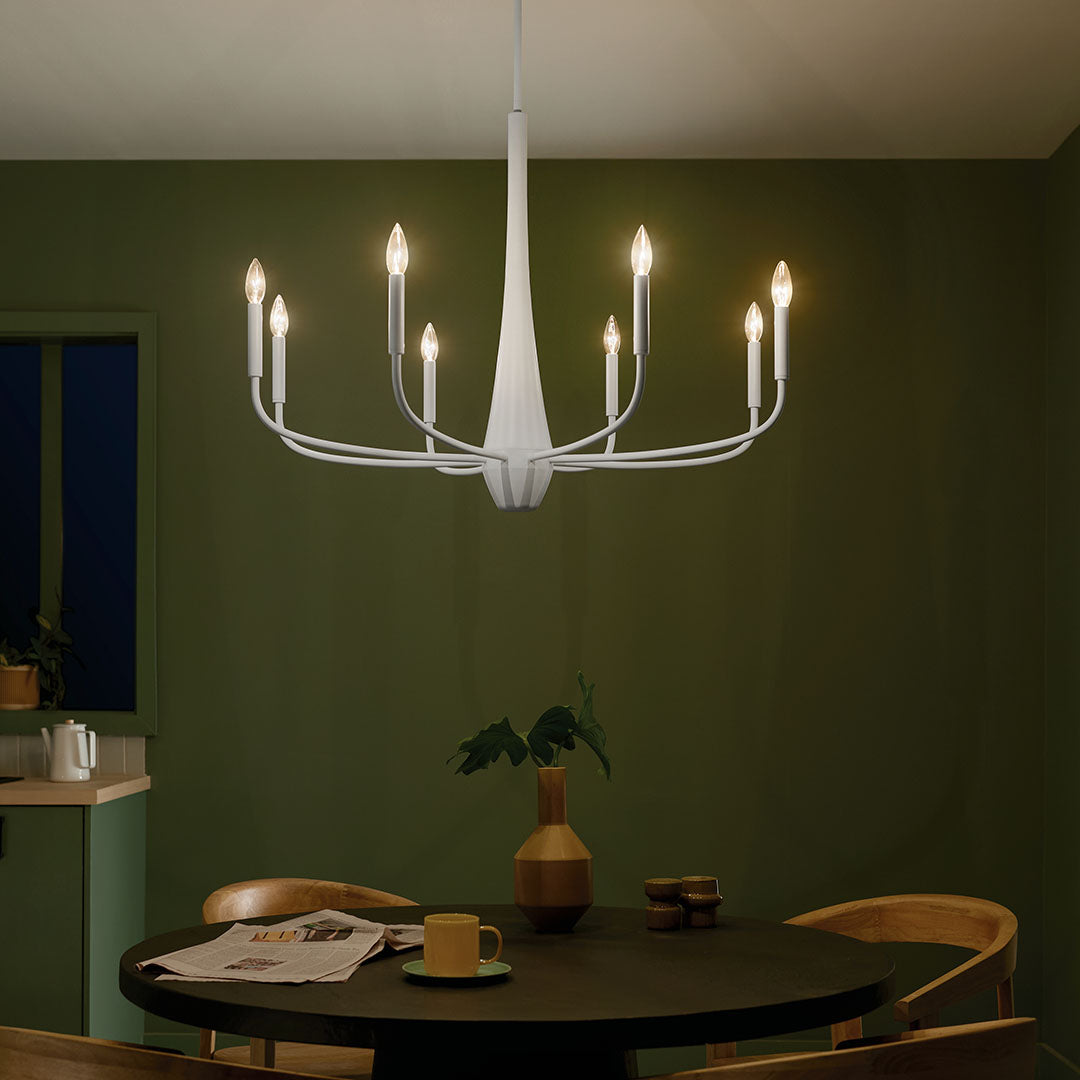 - A modern eight-light chandelier lends sleek elegance to a family dining room or welcoming foyer