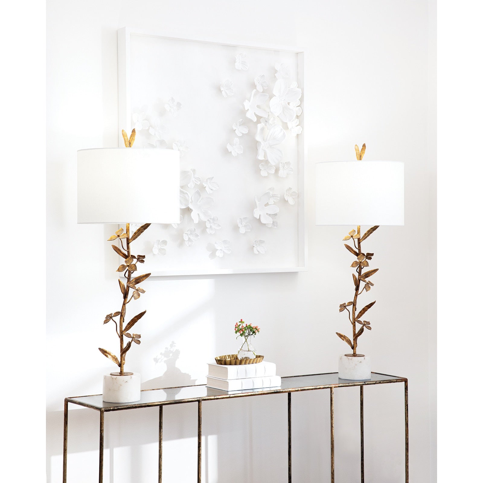 Balancing Old World elegance with rustic charm, each branch of the Trillium buffet lamp is cast and gilded in an antique gold leaf finish. Place as a pair on either end of a buffet or entry table to create a uniquely dramatic statement. When lit, this buffet lamp comes alive as its gilded leaves bask in the warm glow from above. A classic, natural linen drum shade and matching cast leaf finial finish the look.
