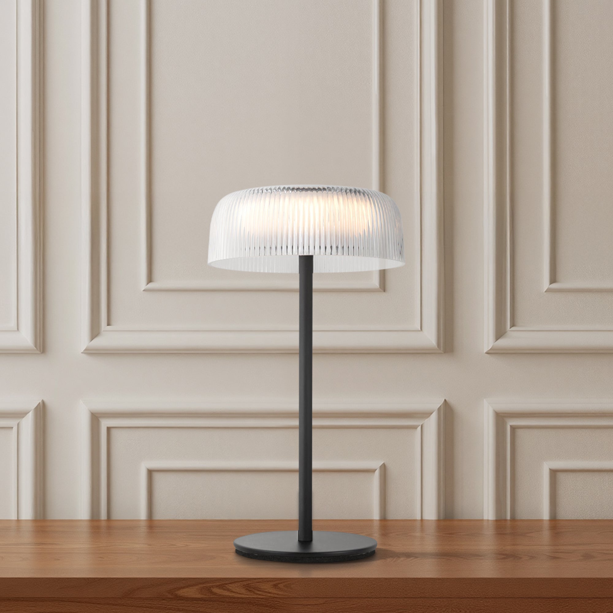 The Aurora LED Table Lamp fuses elegance and functionality in a compact design. Its ribbed acrylic shade sparkles like cut crystal, casting a refined glow that enhances bedrooms, offices, and living spaces alike. Sleek black accents add a contemporary edge, while the rechargeable battery offers cordless convenience for flexible placement anywhere in your home.