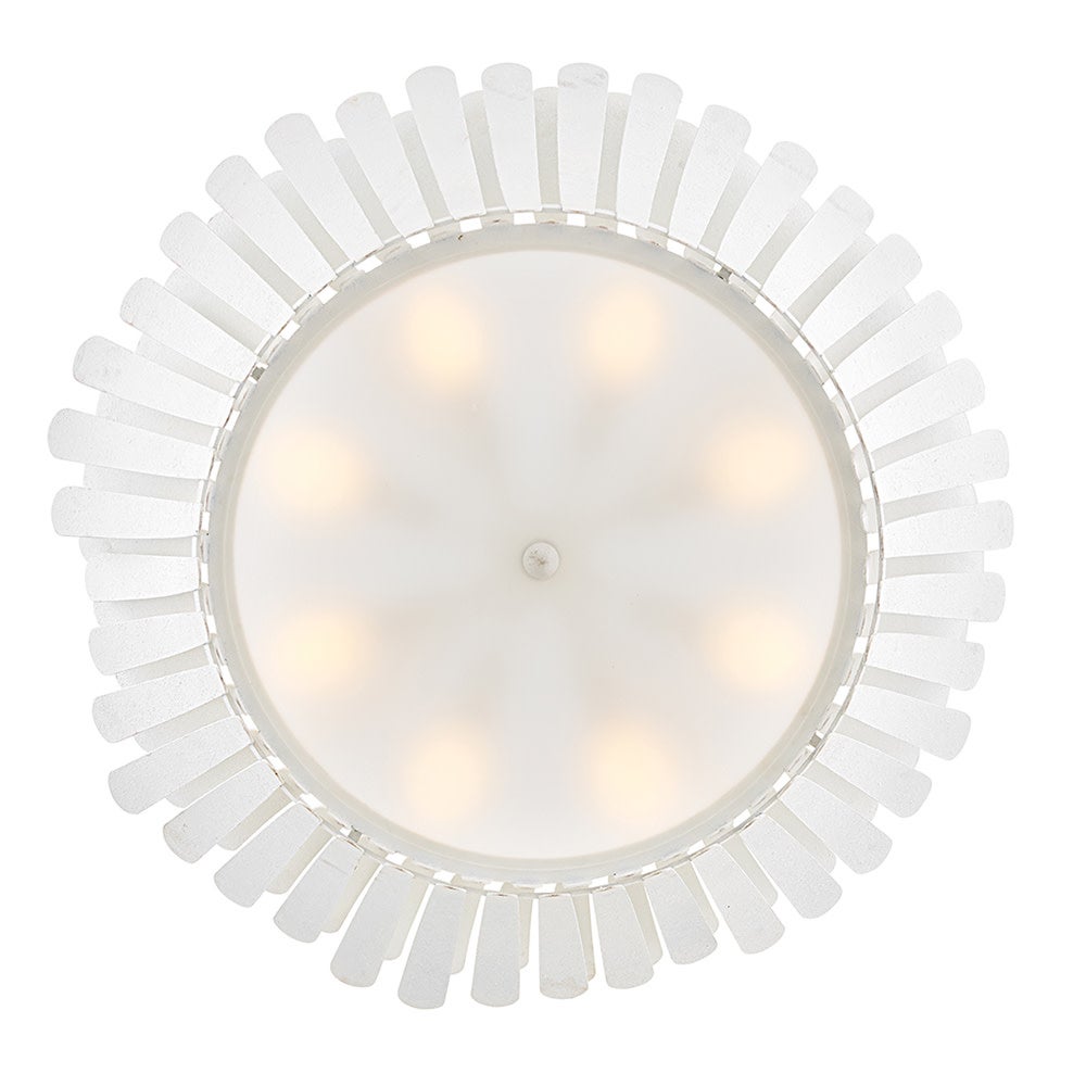 - Lights are tucked within a drum of etched white glass to gently diffuse illumination