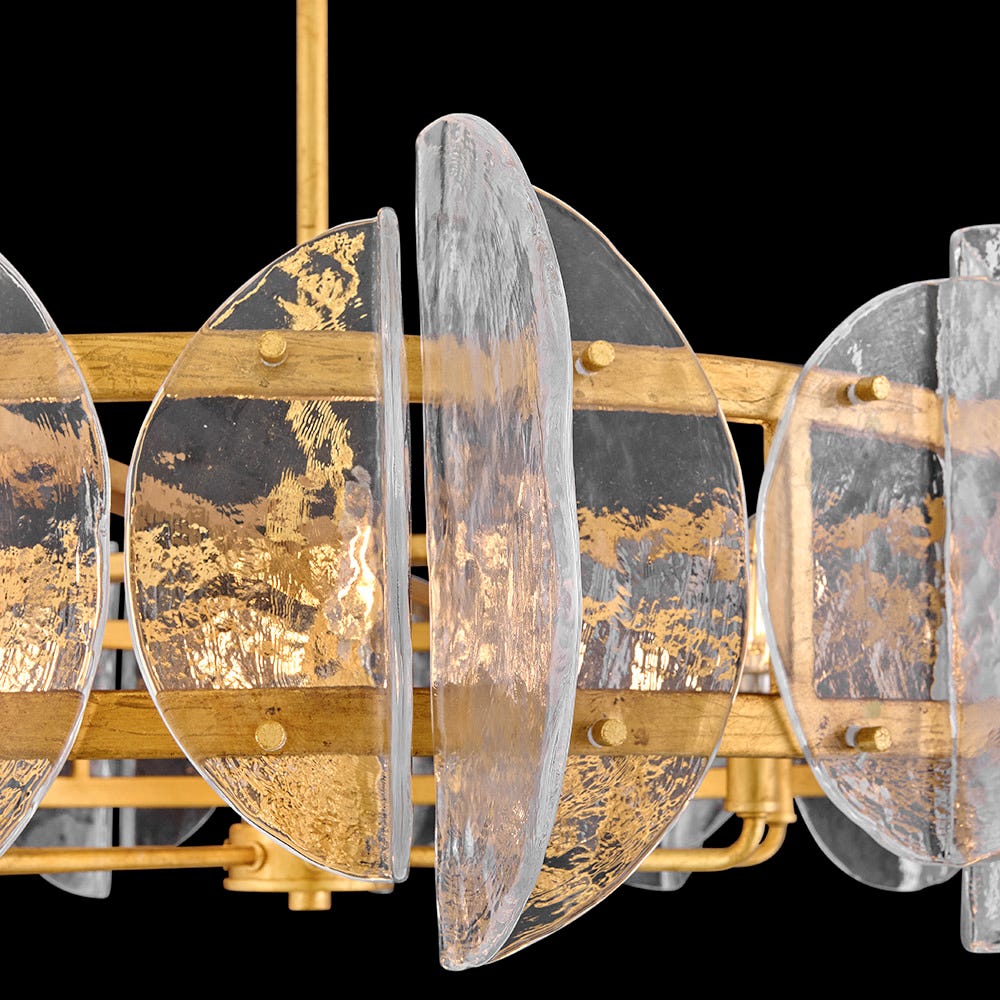 Opulent folded panes of textural water glass surround Seraphina’s glamorous, Distressed Brass frame, creating varied refractions and softly diffusing warm illumination throughout your space. A versatile yet stately silhouette makes a chic transitional statement in both modern and traditional settings.
