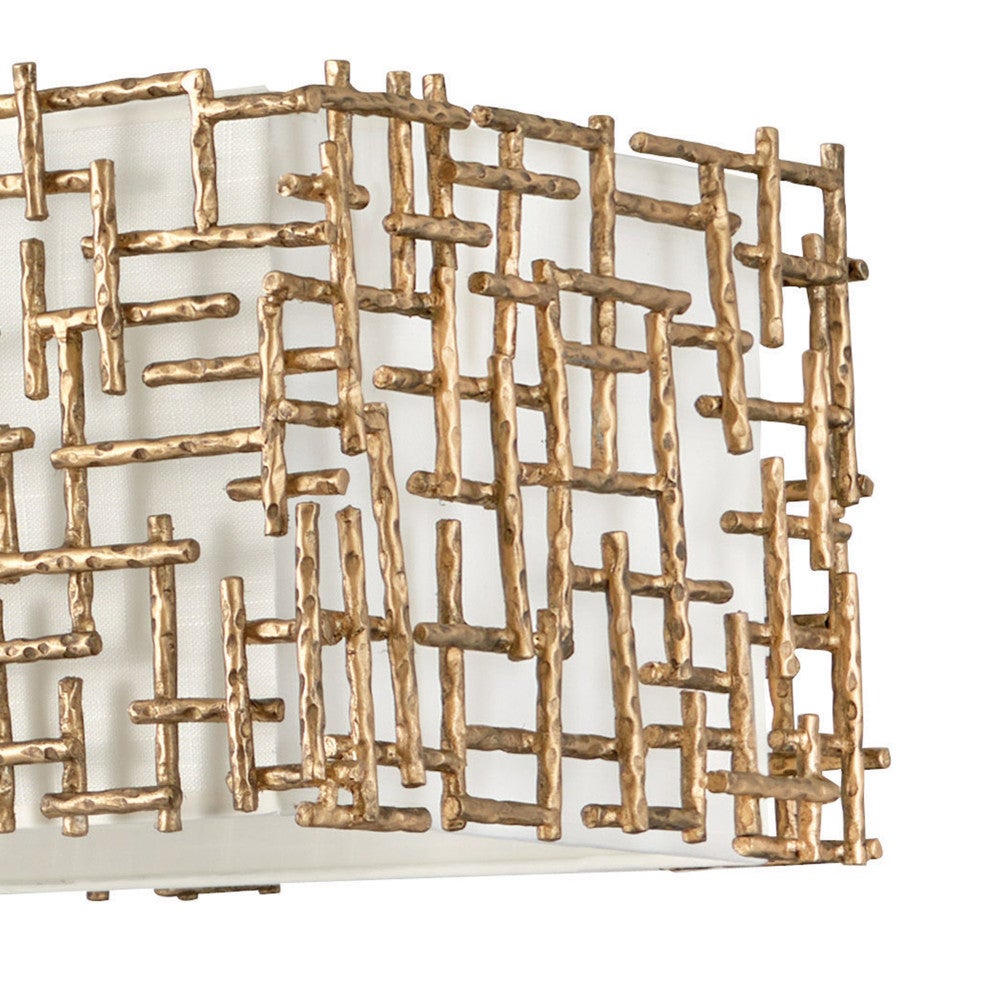 Farrah’s contemporary design is bold and sculptural, while achieving an optical airiness. The hand-hammered crosshatch bars gleam in a hand-applied Silver Leaf or Burnished Gold finish with artisanal detailing that carries through to the canopy detail. Set against a White Linen shade, Farrah creates a look of deconstructed; modern elegance.