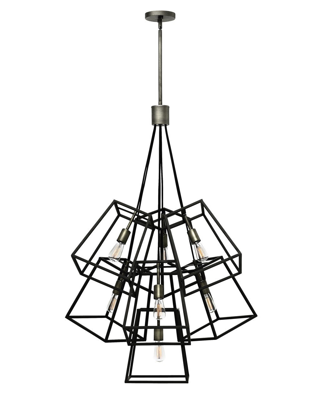 • Bold open metalwork creates interest and definition in this seven-light multi-tier open-frame chandelier