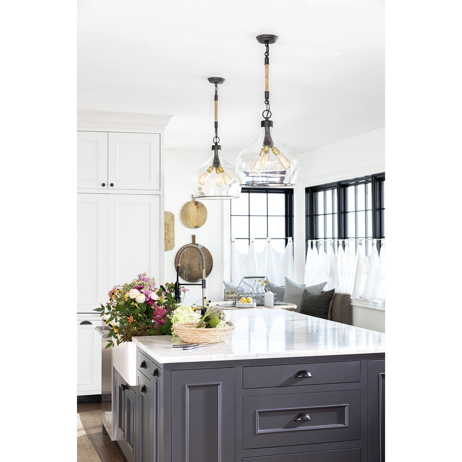 A glass demijohn bottle hangs from twisted jute rope to illuminate & add refreshing character over an island, sink, or dining table. Thoughtful detailing, such as a copper edge and glass medallion make this pendant the perfect balance of casual and sophisticated.