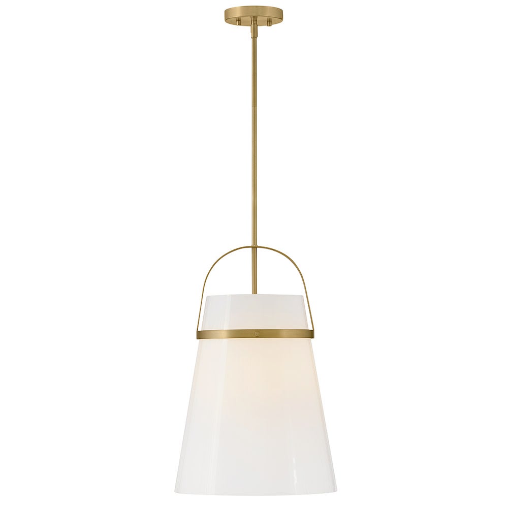 - Elegant pendant that combines soft opal glass with the gentle glow of lacquered brass