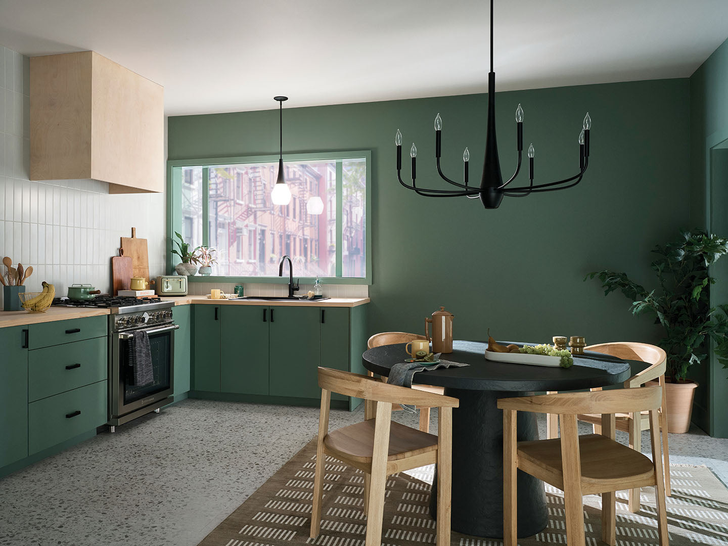 • A modern pendant light lends sleek elegance over a gathering space or kitchen island