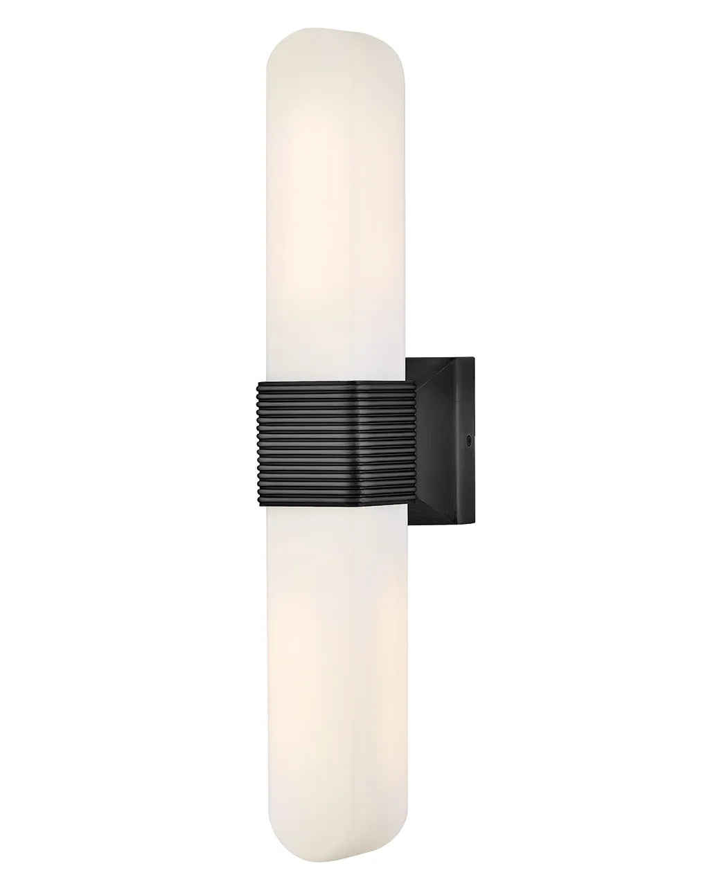 Modern with a rounded, elongated silhouette, Cotes’ Etched Opal glass is accentuated by a ribbed collar in a Lacquered Brass or Painted Black Oxide finish. The curved glass juxtaposed against square details offers a soft balance of shapes that is elegant yet versatile enough to complement any bathroom or living space.