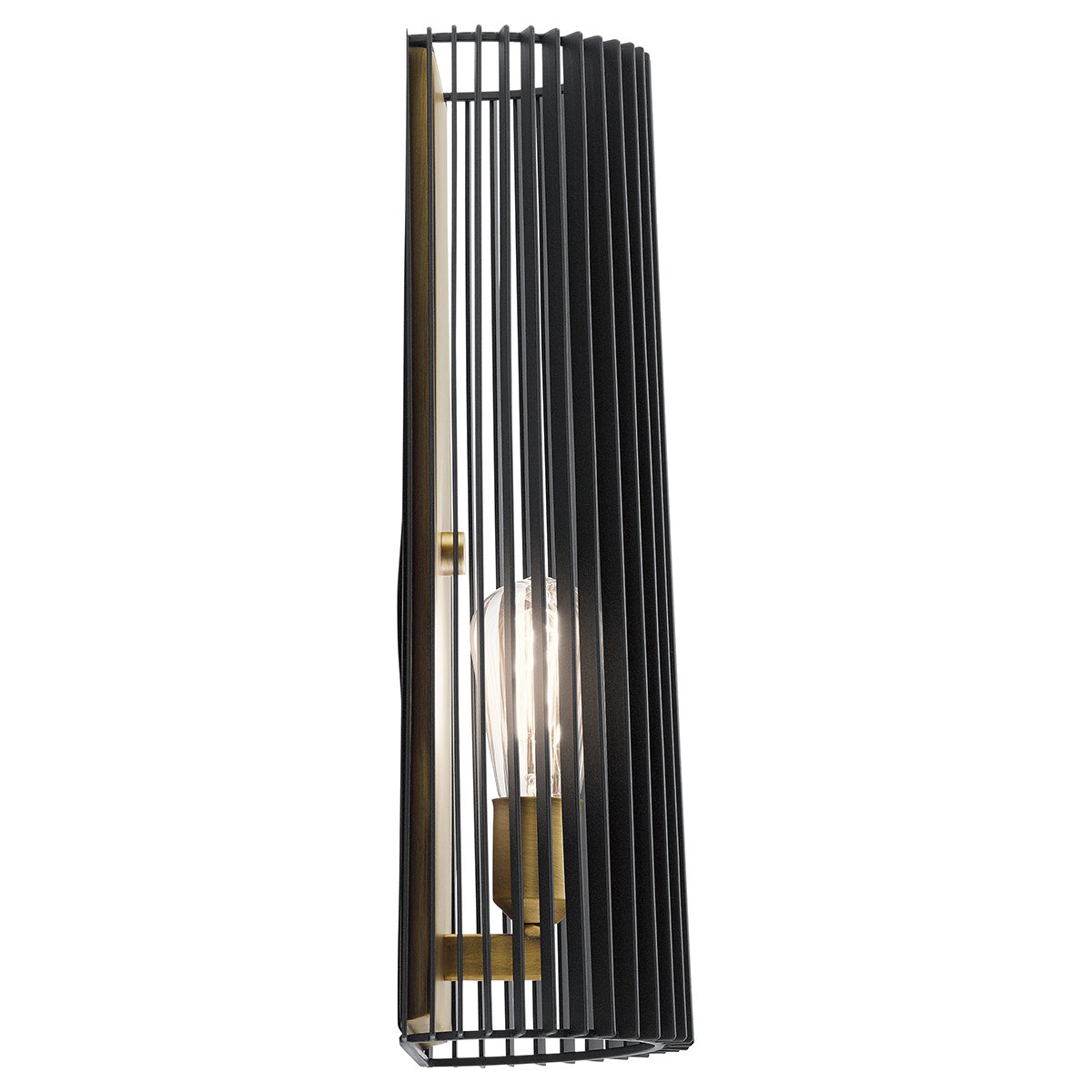 Upgrade modern living spaces with a contemporary one-light wall sconce. Designed for impact, it's a beautiful pairing of natural brass and matte black finishes. The slatted shade curves around a solid wall plate, allowing light to filter through and offering a peek at the richness of its brass details.